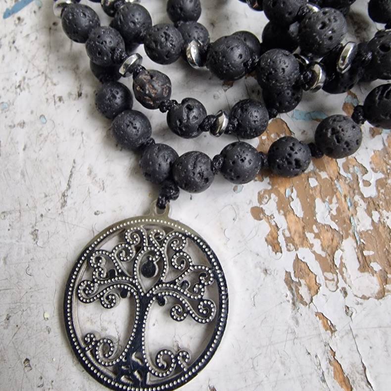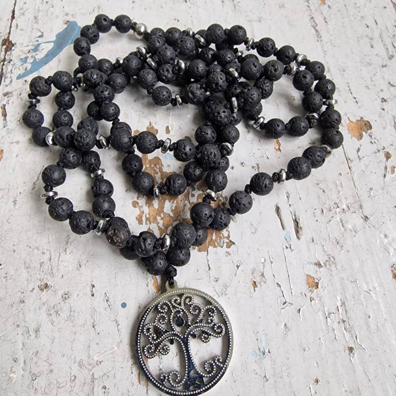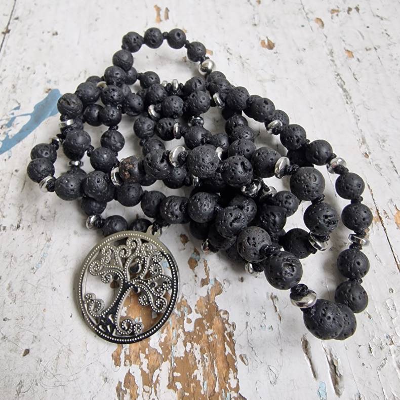 Kæden er nøje bundet som en fuld mala med 6 mm lavasten, der siges at bringe stabilitet og styrke, og forsølvede hæmatitperler, der stråler med et let, diskret skær.