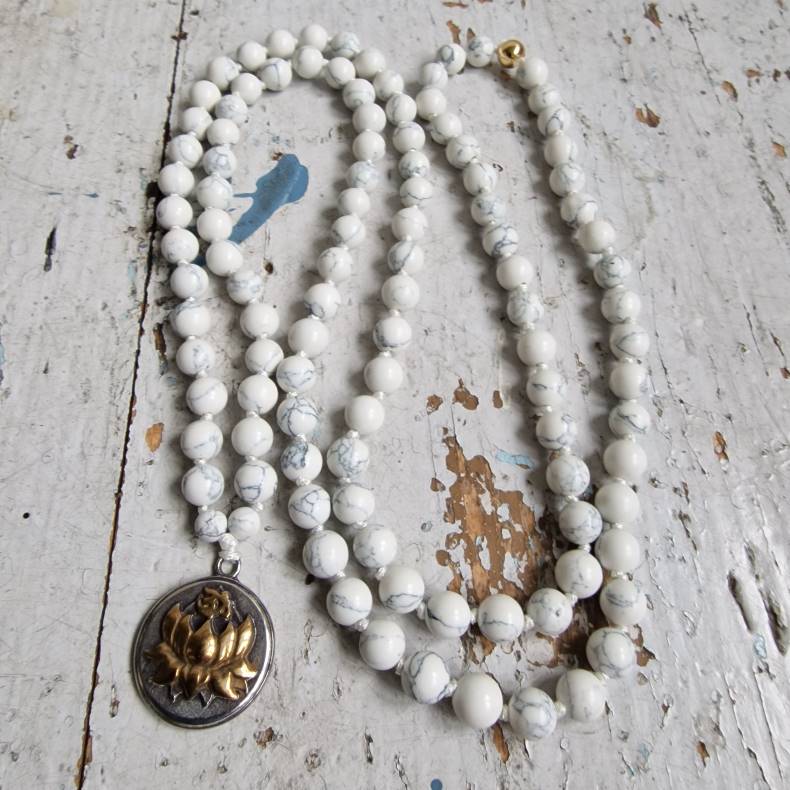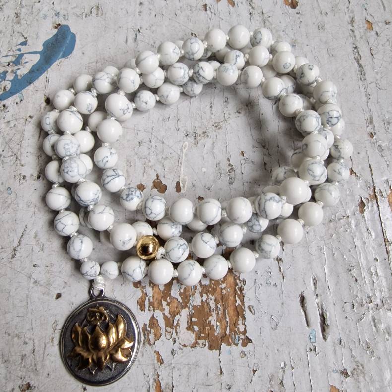 Håndbundet med 6 mm hvide howlite-sten, er denne mala ikke kun smuk at bære, men også beroligende og jordforbundet.
