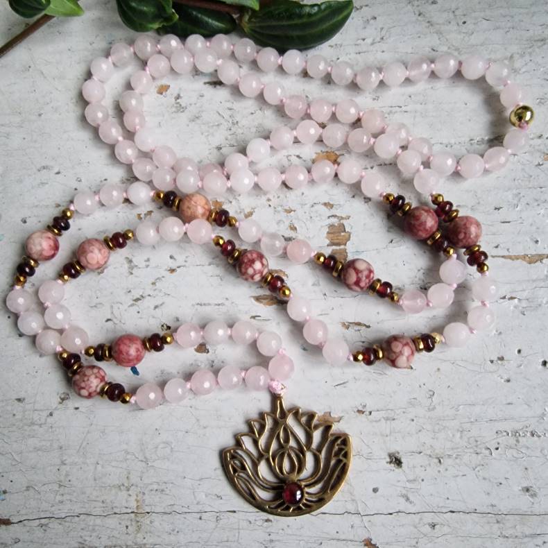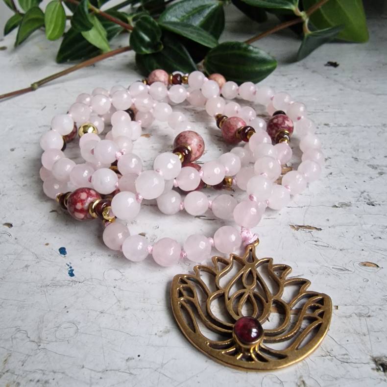 Denne unikke håndbundne mala er ikke bare et smykke, men en livslang følgesvend. Med sine 108 sten på en sart rosa snor, omhyggeligt bundet mellem hver eneste perle, forener den boheme-stil med luksus og mening. Det smukke lotusvedhæng i messing, prydet med en indfattet granat, symboliserer renhed og styrke.