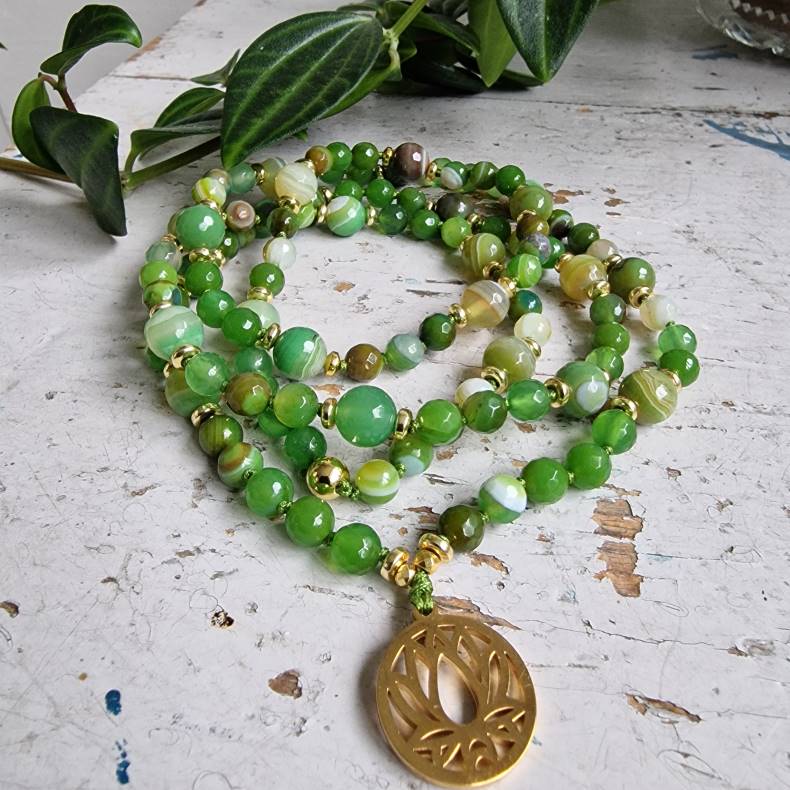 Stenene er et smukt mix af 6 og 8 mm stribede, indfarvede agater i friske græsgrønne nuancer – farver, der signalerer vækst, balance og livsglæde. De forgyldte hæmatit-detaljer tilføjer et strejf af luksus, mens det fine lotusvedhæng på ca. 2 cm fuldender udtrykket med symbolik for renhed og spirituel styrke.