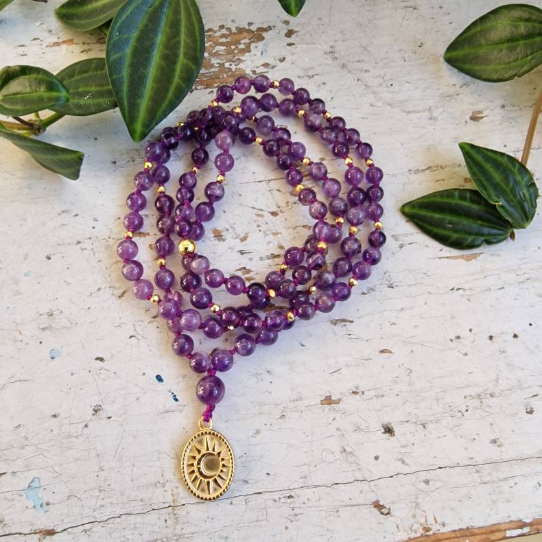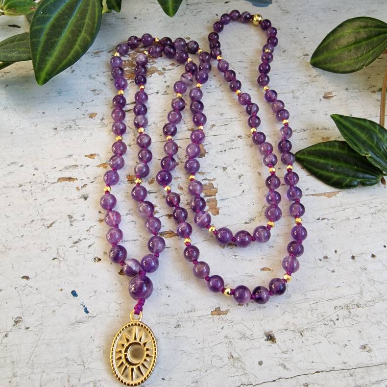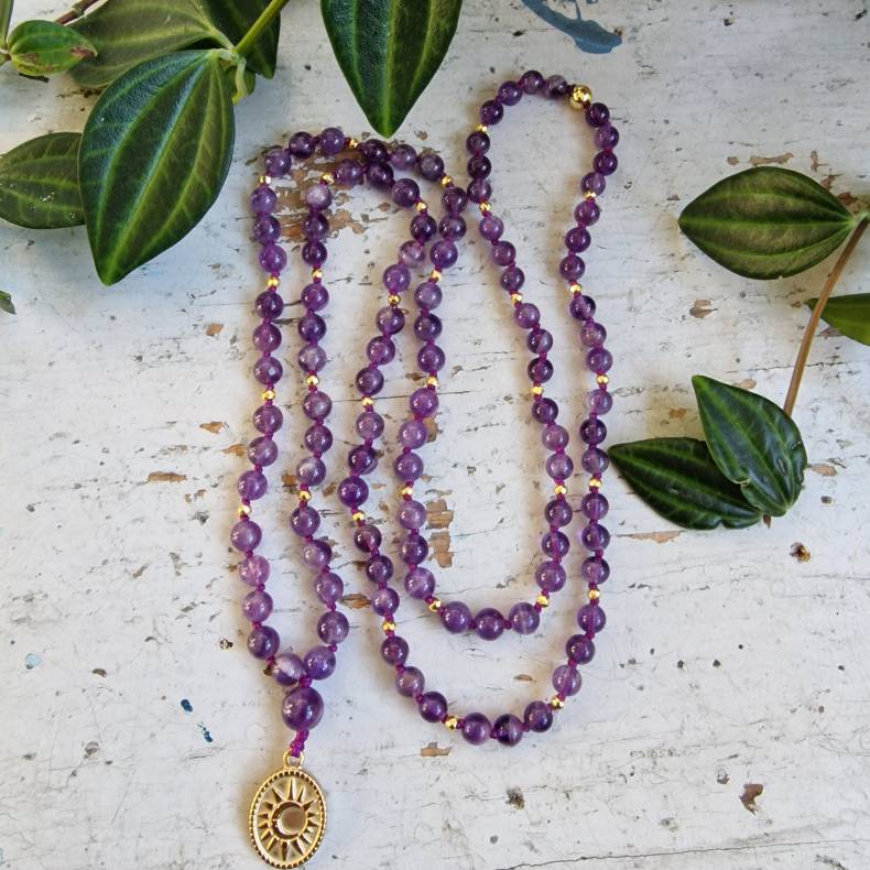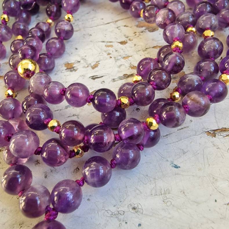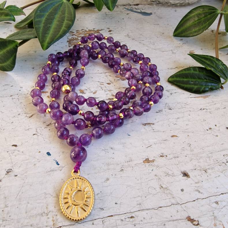 Denne luksuriøse boheme-mala er håndbundet med omhu og kærlighed. Bestående af 108 smukke ametyststen på 6 mm, hver adskilt af fine knuder, er denne mala et kunstværk i sig selv.