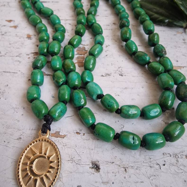 Med 108 sten ( købt som turkis)i fortryllende grønne nuancer – ligner mere dybt grønne chrysocholla  med et forsigtigt stræf af sort og lidt turkis – er hver knude kærligt bundet mellem stenene. Malaen måler ca. 106 cm, perfekt til meditation eller som et personligt statement. Vedhænget i rustfrit stål, prydet med sol og måne samt forgyldt hæmatit, tilføjer en elegant finish.