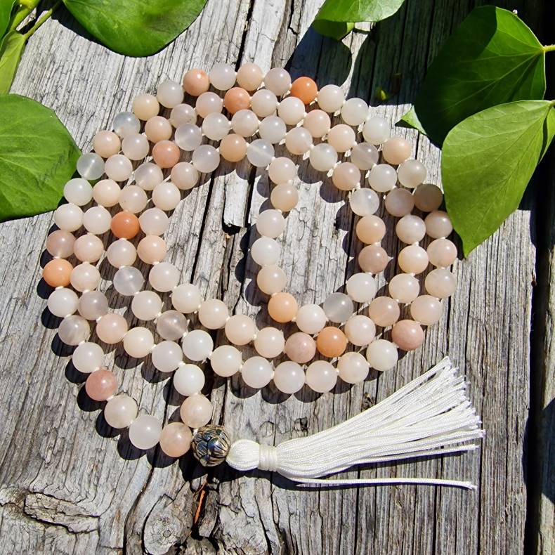 Denne mala, med en længde på ca. 115 cm, heraf en fortryllende 6,5 cm ferskenfarvet aventurin-tassel, er mere end blot en perlerække.