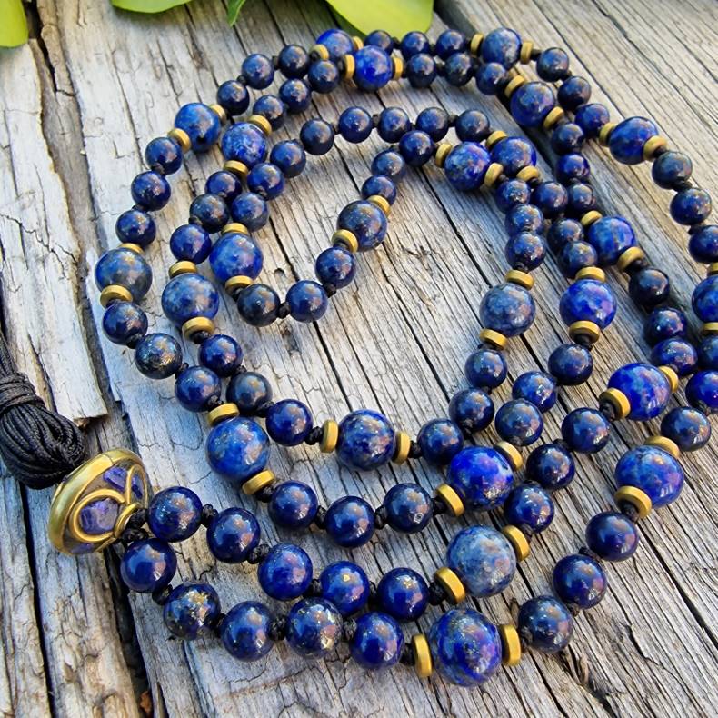 Vores håndlavede malaer måler cirka 120 cm, inklusive en elegant 10 cm tassel, der fuldender designet med et strejf af elegance. Guruperlen er en skat fra Nepal, udsmykket med messing og smukke indlagte lapisstykker, der symboliserer visdom og indre fred.