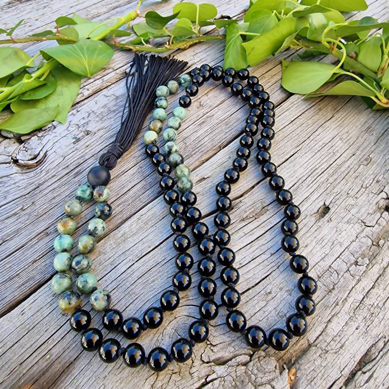 Denne 124 cm lange perlekrans er håndlavet med kærlighed og omhu, hver eneste af dens onyx-perler og afrikanske turkis-sten fortæller en historie om jordens dybe energier og åndelig forbindelse.