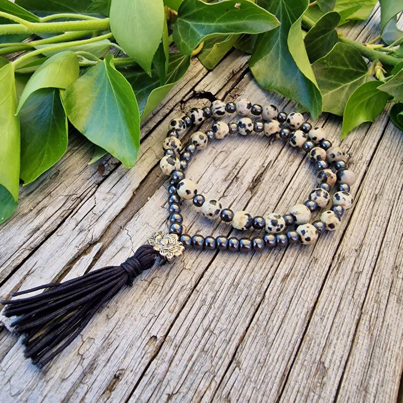Find ro i små øjeblikke med vores håndlavede håndleds mala, fremstillet af dalmatiner jaspis og hematit.