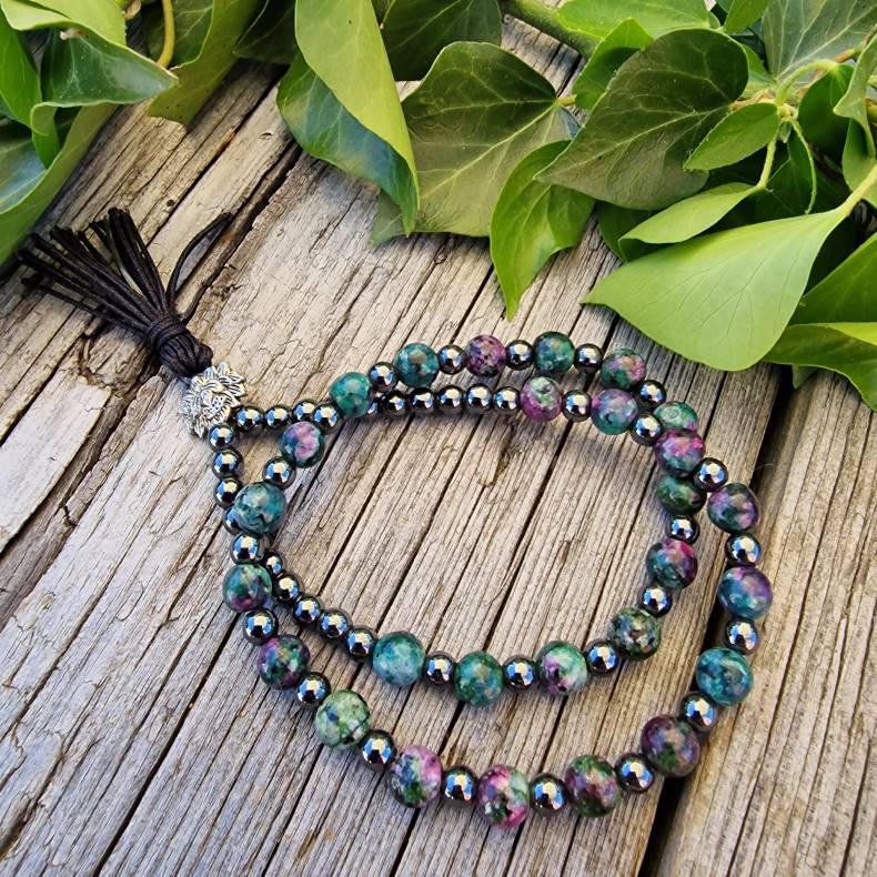 Tag en pause fra hverdagens stress med vores smukke håndleds mala, fremstillet af fine indfarvede manmade Ruby Zonite og elegant hematit.