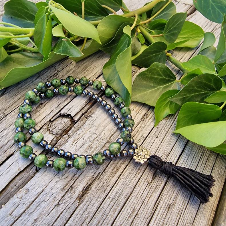 Oplev balance og skønhed med vores dobbelte håndleds mala, fremstillet af manmade og indfarvet candyjade og hematit i smuk grøn farve.
