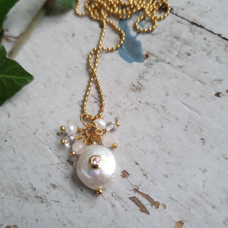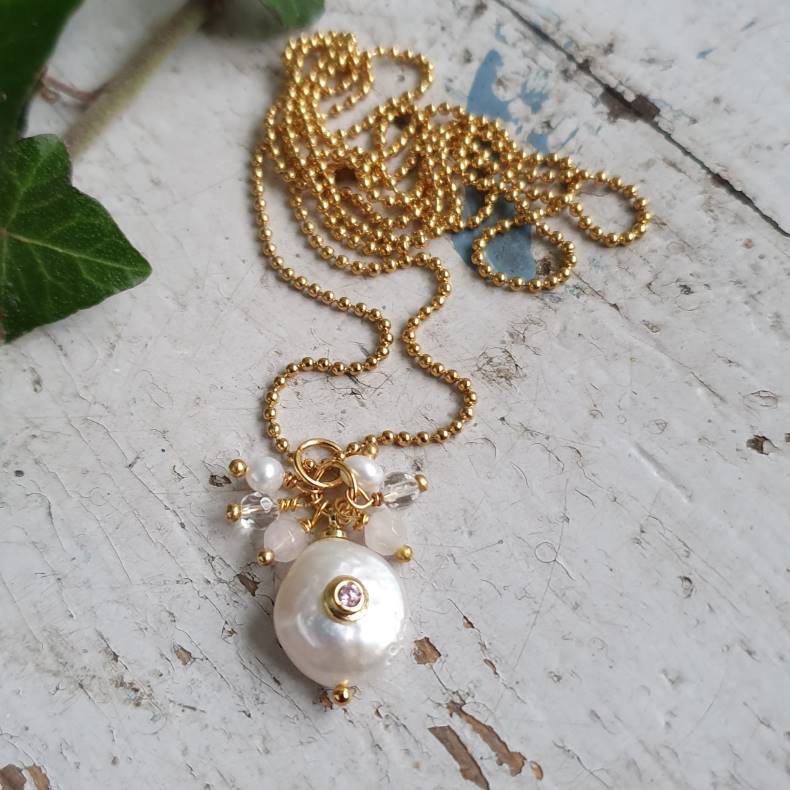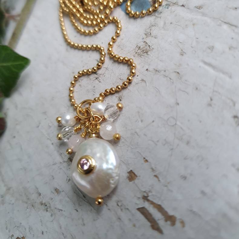 Sammen med de delikate ferskvandsperler, bjergkrystaller og rosa quartz skaber dette halskæde en harmonisk balance mellem klassisk skønhed og moderne stil.