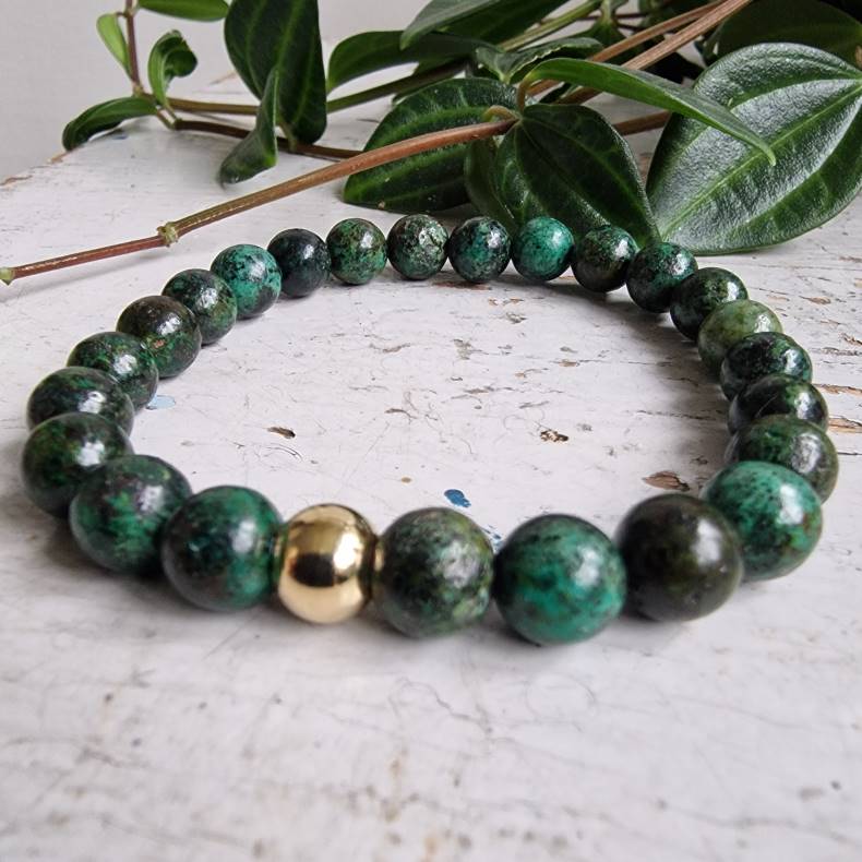 Dette armbånd er ikke bare en accessory – det er et statement. De 8 mm perler af afrikansk turkis, der egentlig er en variant af jaspis, forener jordnære grønne, turkise og brune toner med naturlige mønstre, der emmer af karakter. Perfekt til ham, der sætter pris på autentiske materialer og et look, der er både råt og sofistikeret.