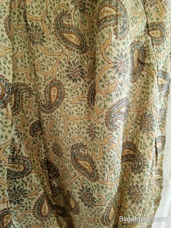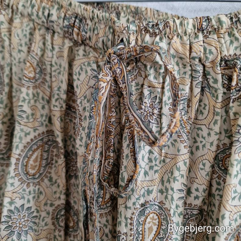 Lommer i begge sider, bred elastik i livet og bindebånd samt elastik i benene.