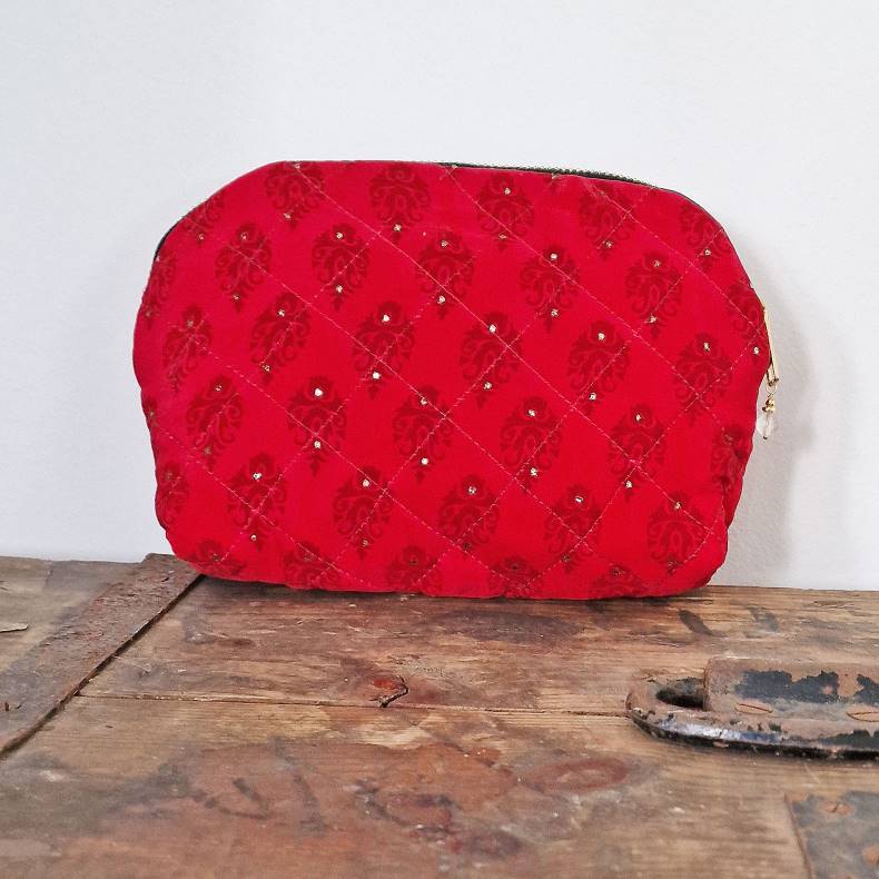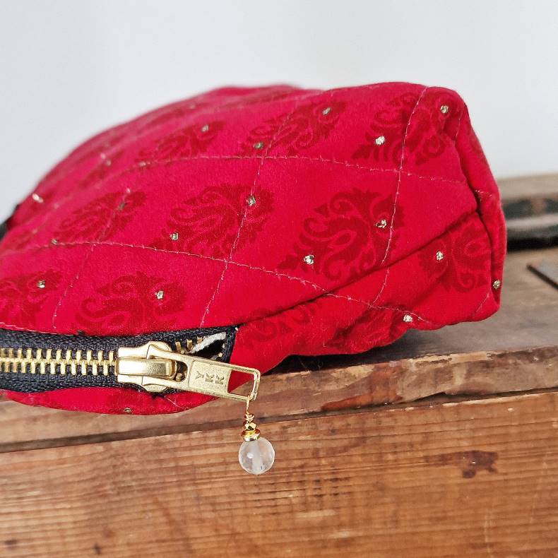 En lækker pung, skabt af vintage silke sari-rester, giver et unikt præg til din hverdag. Syet med en gylden lynlås i høj kvalitet og vatterede stikninger, er den både elegant og praktisk. Den røde farve i kraftig crepesilke prydes af små "diamanter", der tilføjer et glimt af glamour.