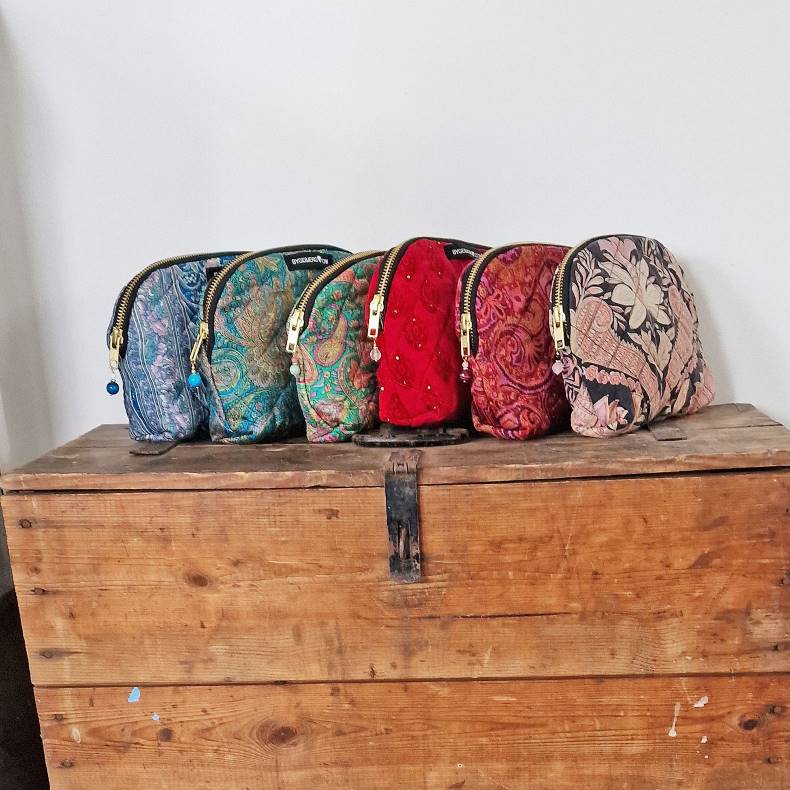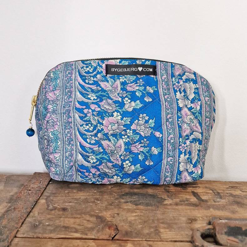 Skøn kosmetikpung syet af vintage silke sari, der stammer fra tøjproduktionens overskud. Derfor er den modtagne pung ikke nødvendigvis helt magen til. Den gyldne lynlås er af høj kvalitet og giver et elegant præg, mens de vatterede stikninger sikrer både holdbarhed og charme. Indersiden er lavet af kraftigt bomuld, der beskytter dine skønhedsprodukter.