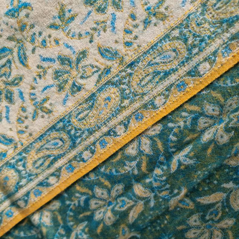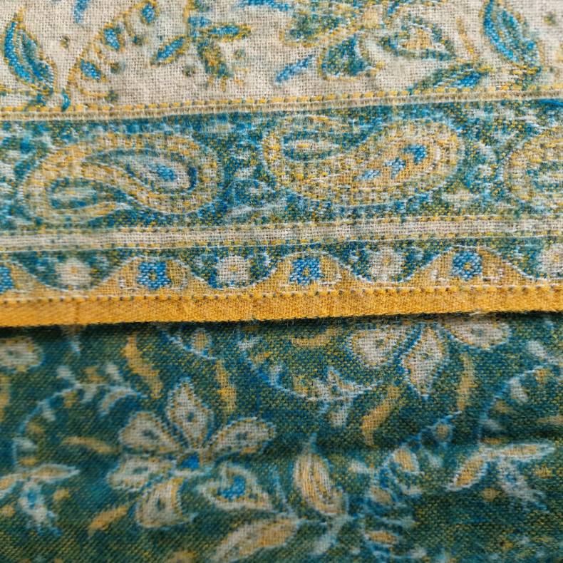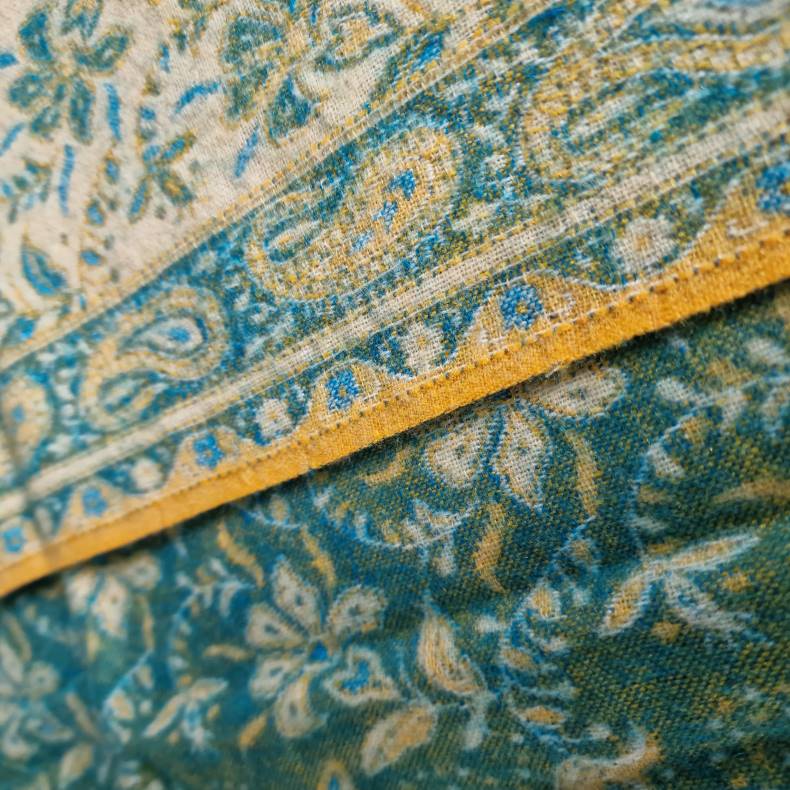 Håndplukket i Indien og vævet med yak-uld er det designet til at give støtte under yoga og meditation og varme på de stille aftener. Farverne i grøn, turkis, gul og fløde tilføjer liv og sjæl til ethvert rum.