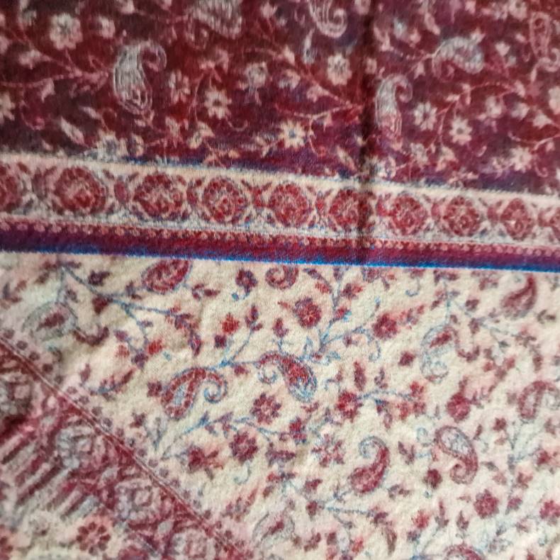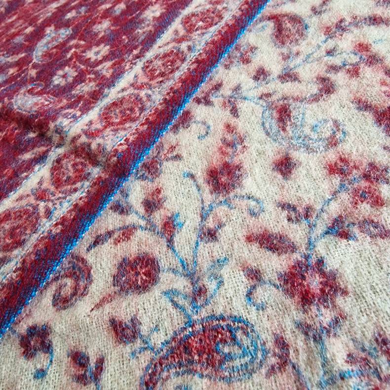 Farverne i flødefarvet, rødbrun og  turkis med turkis frynser giver en unik skønhed, som passer ind i ethvert hjem.