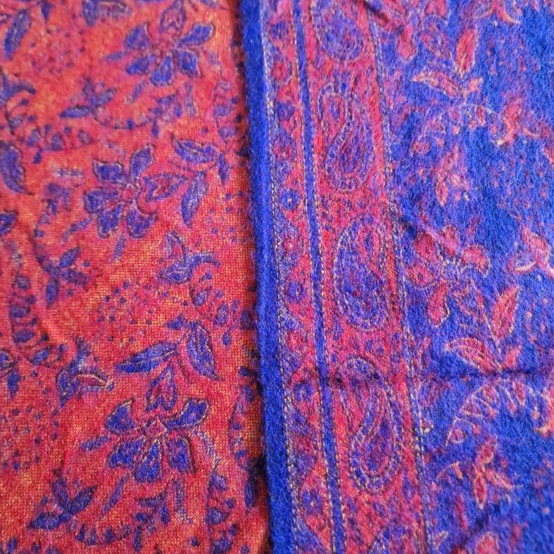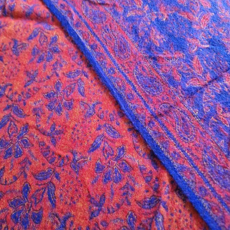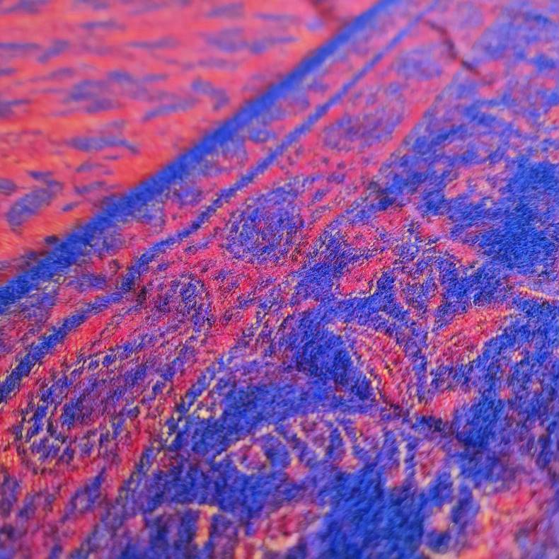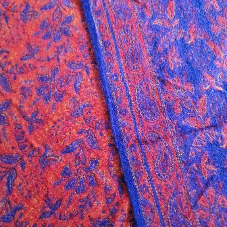 Uanset om du lægger det under knæene, pakker dig ind i det, eller bruger det som en smuk detalje i indretningen, vil de harmoniske farver i blå, og rødbrun med carryfarvede frynser skabe en rolig atmosfære.