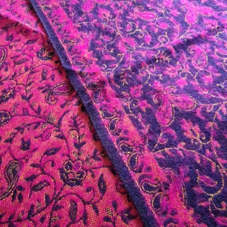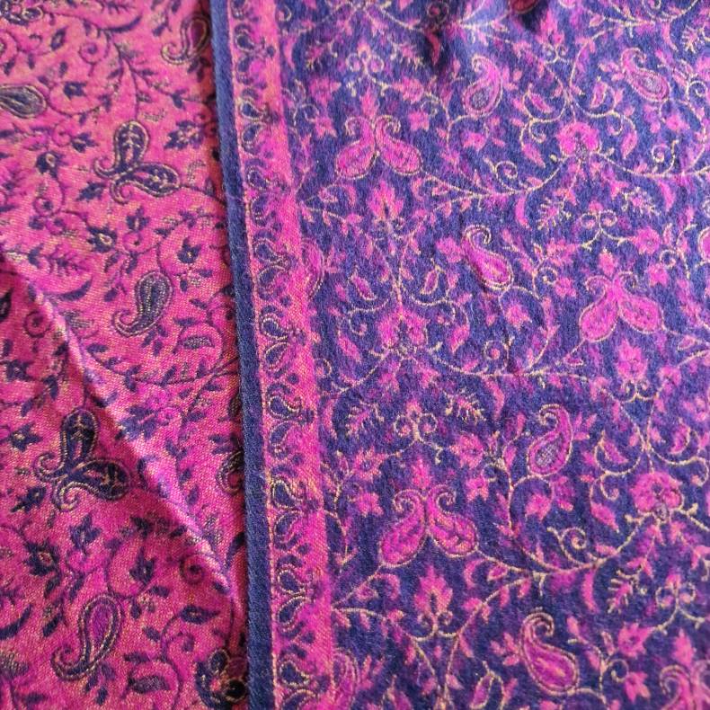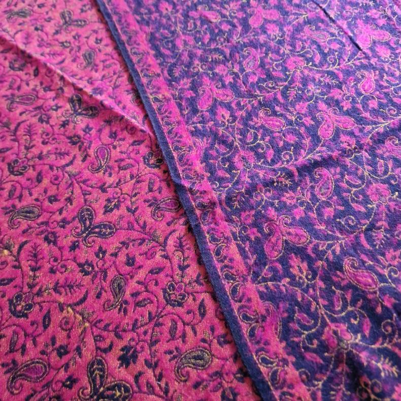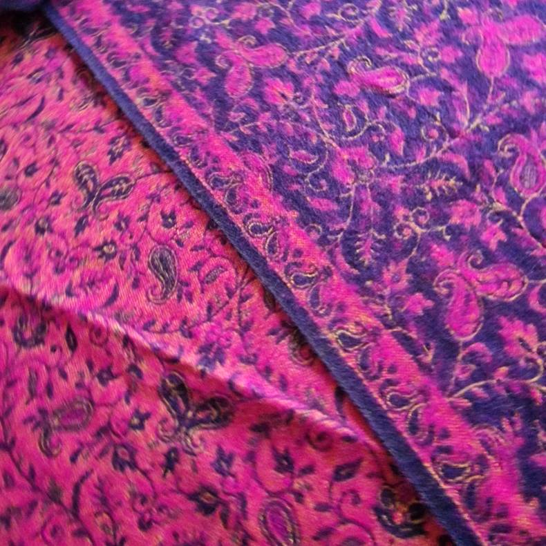 Tæppets varme farver i blålilla, røde toner og sort samt carry bringer et strejf af naturens ro til dit hjem,( frynser er carry farvede) og det passer perfekt til både sofahygge og spirituelle stunder.