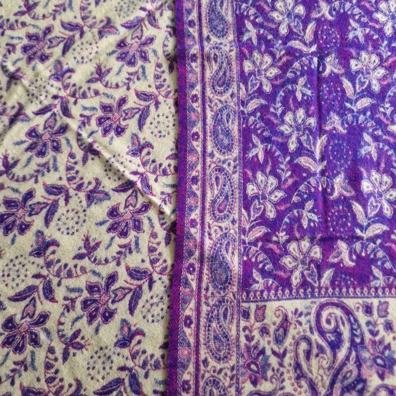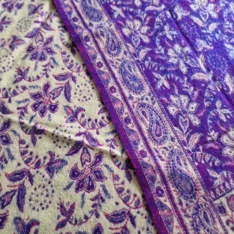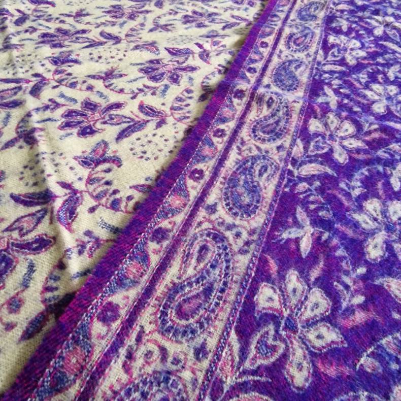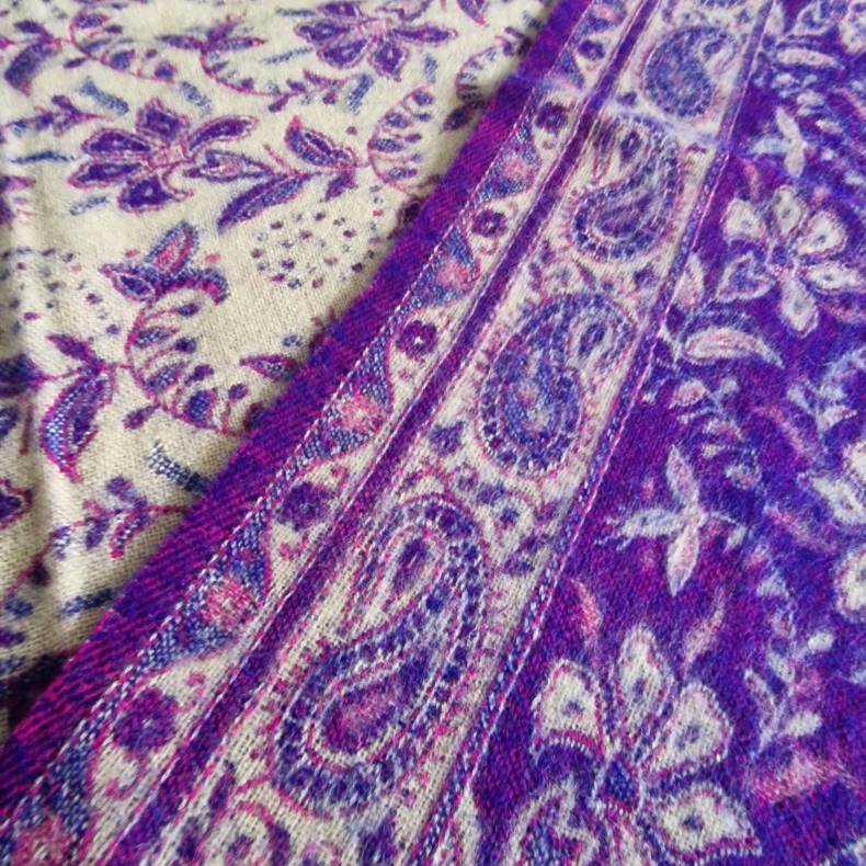 Farvekombinationen af klar lilla, fløde og lillapink gør tæppet med lilla frynser til en elegant tilføjelse til dit hjem.
