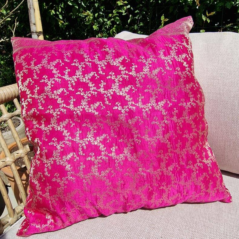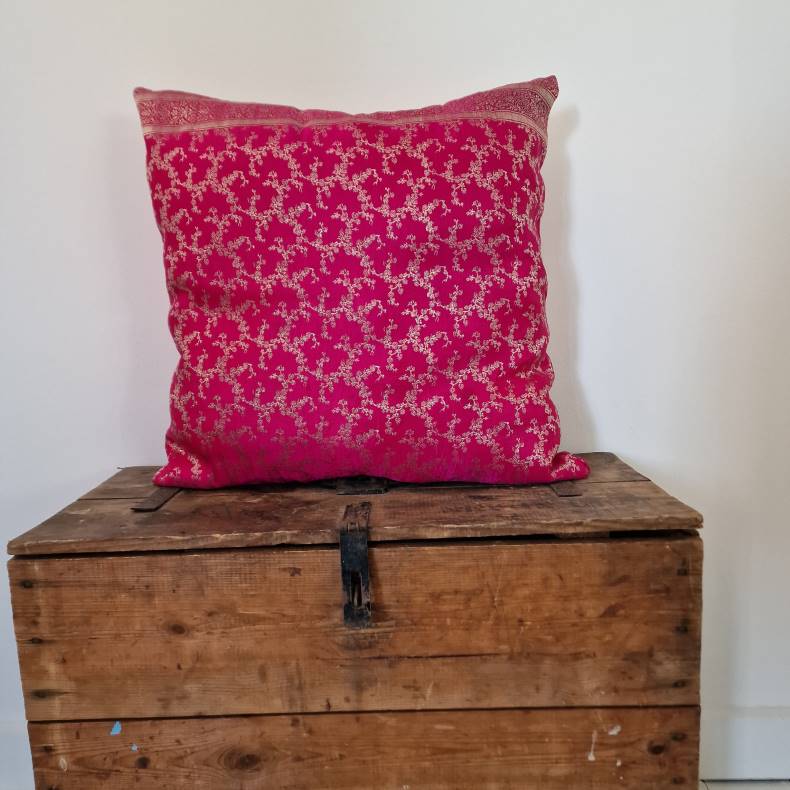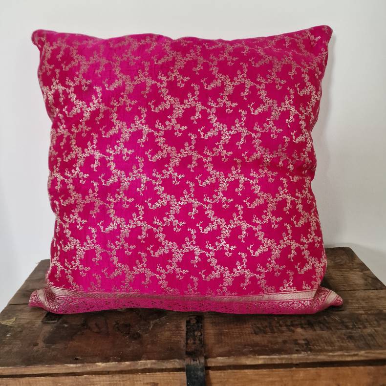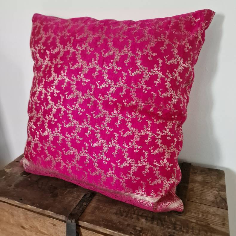 Smukt og helt unikt tungt pudebetræk opsyet i den fineste bryllups sari i klar pink med meget luksus guld vævninger og er derfor tungt i stoffet..