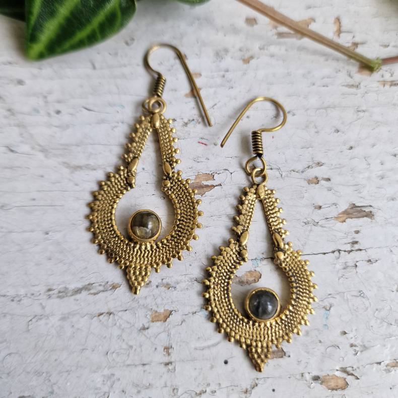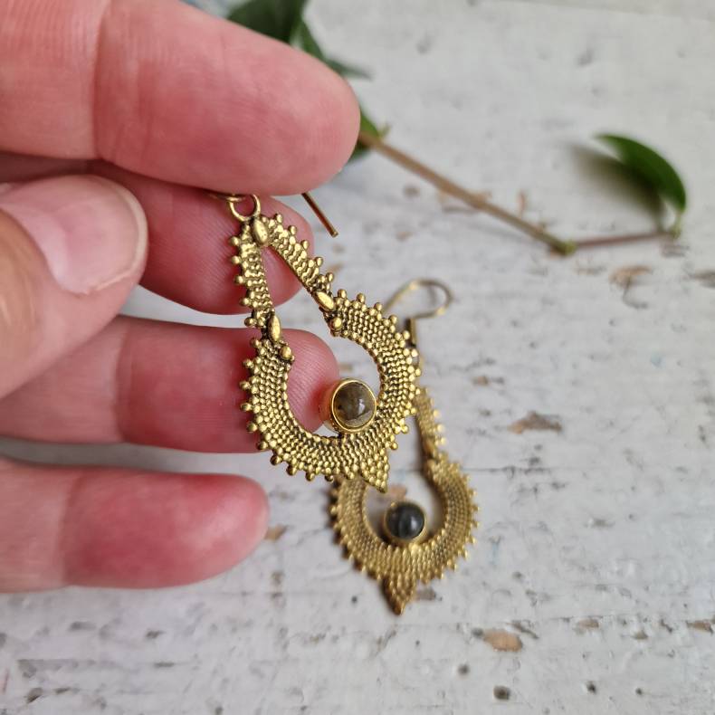 Smukke håndlavede øreringe i messing med klassisk krog, der giver et let og elegant udtryk. Designet er formet med fine kurver og detaljer, hvor en rund, fattet labradorit-sten danner det naturlige centrum. Labradoritens unikke spil af farver giver hvert par sit helt eget udtryk og tilføjer en mystisk og fortryllende glød. Rundt om stenen er smukke mønstre og små kugledetaljer, der fremhæver det traditionelle indiske kunsthåndværk.