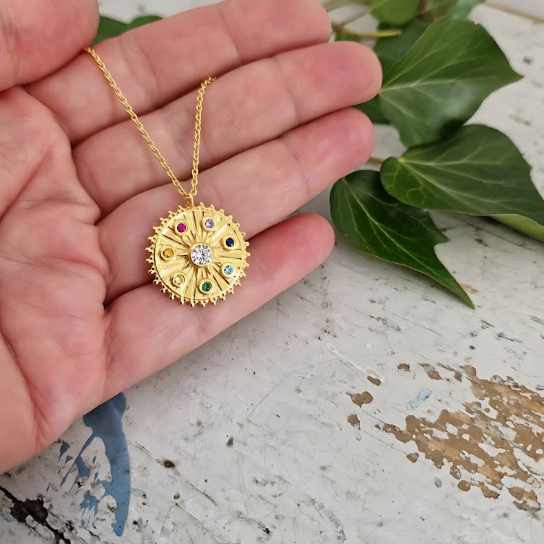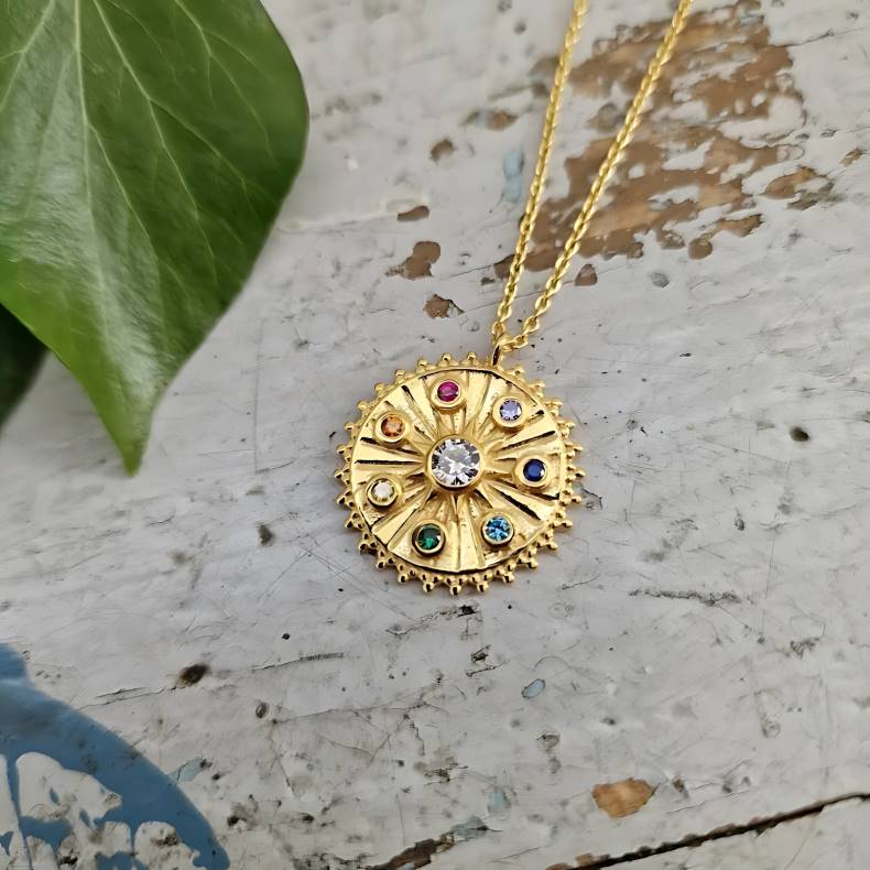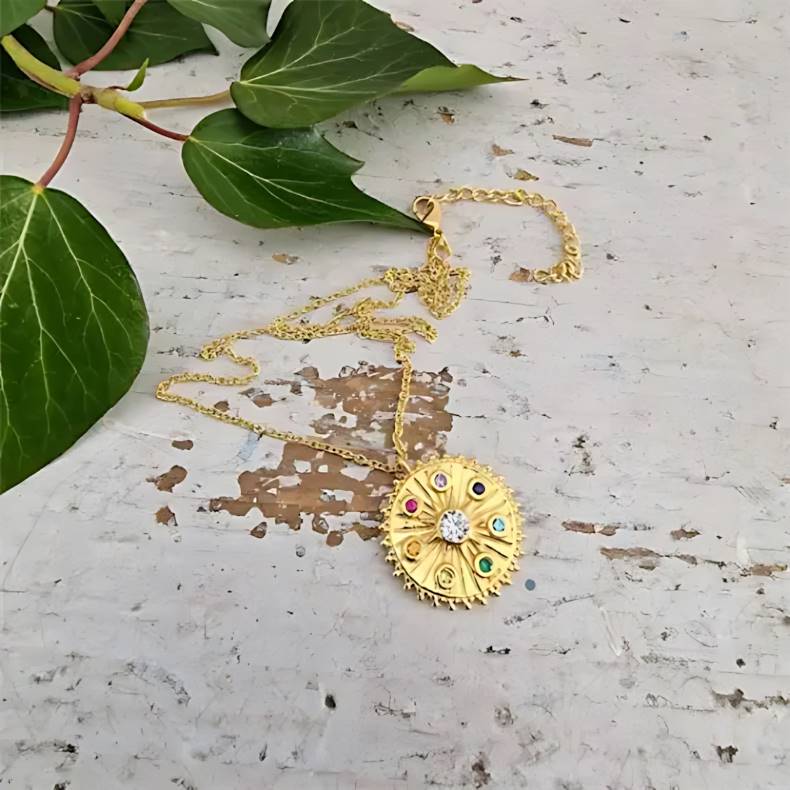 Vedhænget måler ca. 2,2 cm i diameter, perfekt til at tilføje et strejf af elegance til enhver garderobe. Kæden, cirka 41 cm lang med en 5 cm forlænger, sikrer en behagelig pasform. Importeret fra Indien og fremstillet i ægte guldforgyldt messing, er dette smykke både unikt og tidløst.