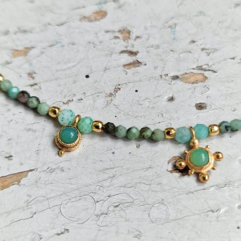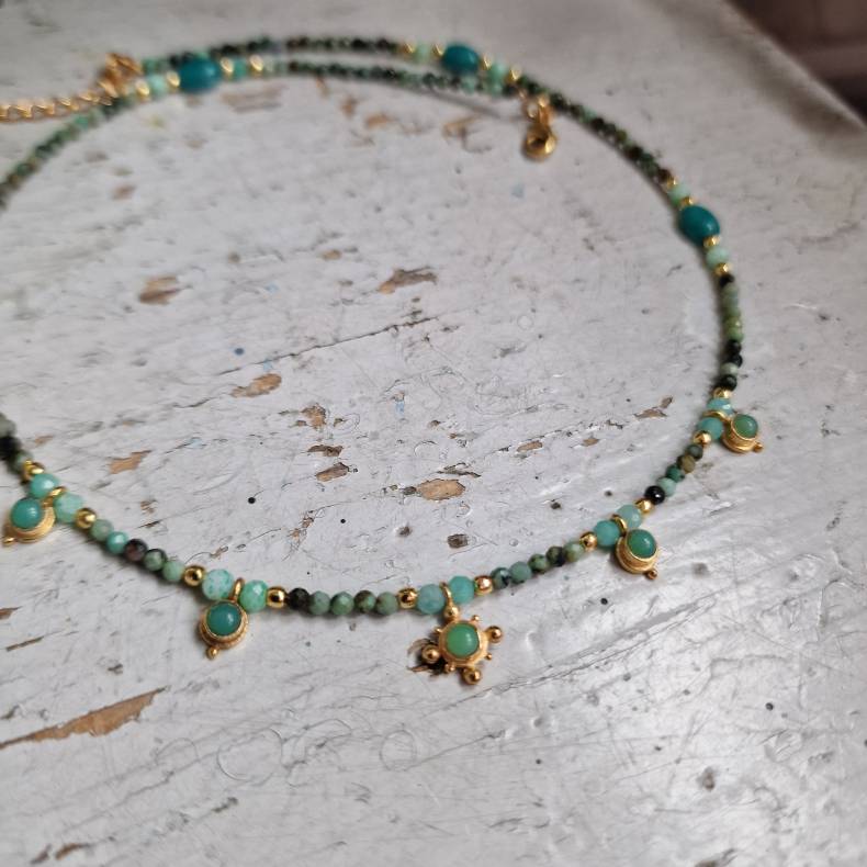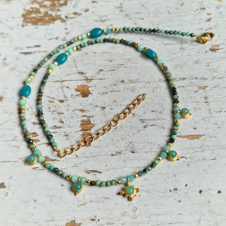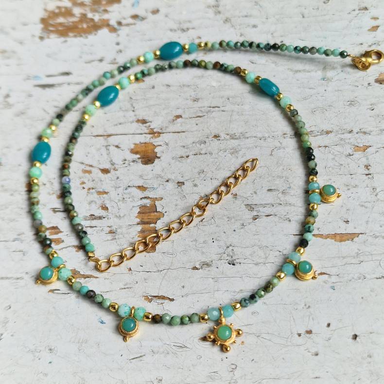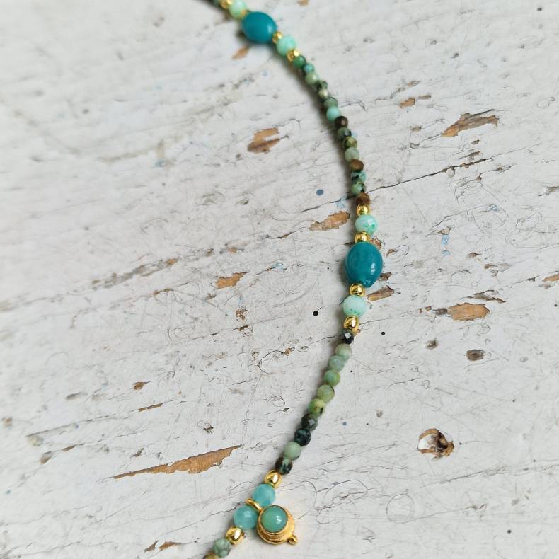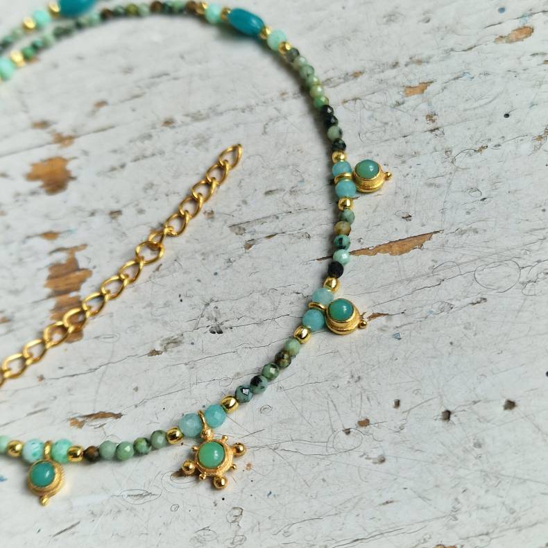 Halskæde med Afrikansk Turkis og Amazonit – Forgyldt Messing