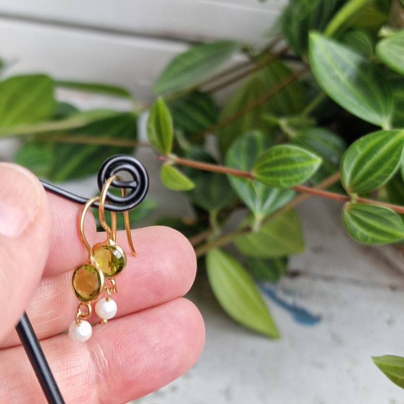 Petite ørebøjler med peridotgrøn quartz og ferskvandsperle