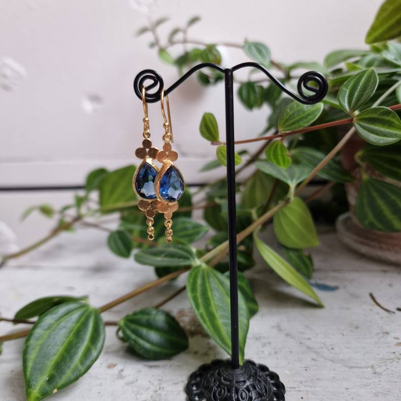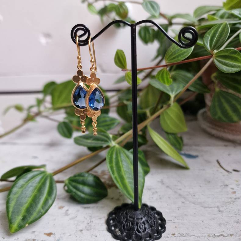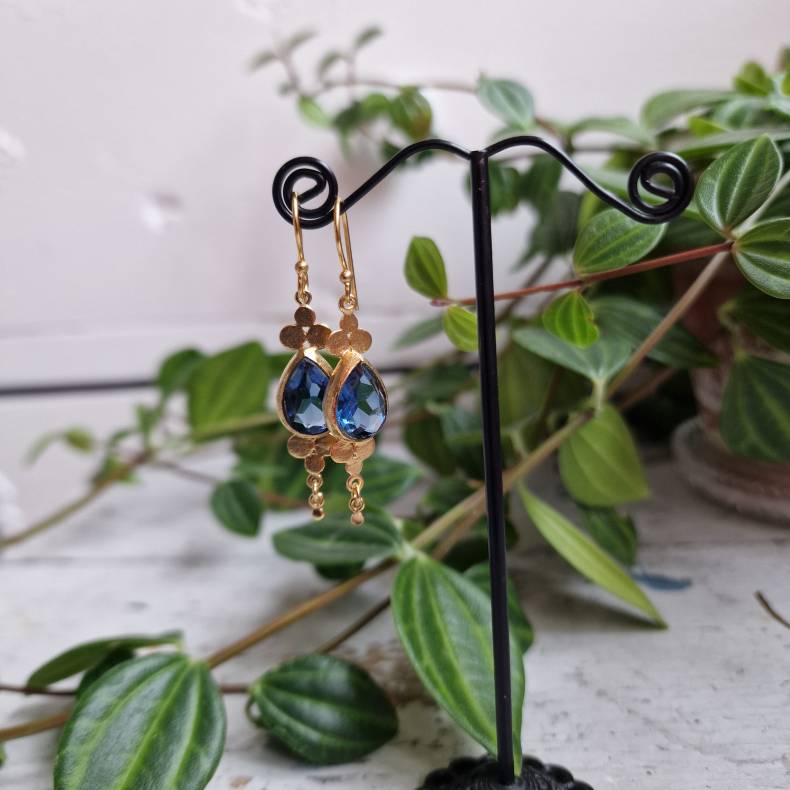 Smukke og unikke øreringe i bøjle med et elegant vedhæng, hvor en klar blå indfattet sten danner centrum i designet. Stenen fremhæves af små fine gyldne kugler både over og under, som giver et harmonisk og detaljerigt udtryk.