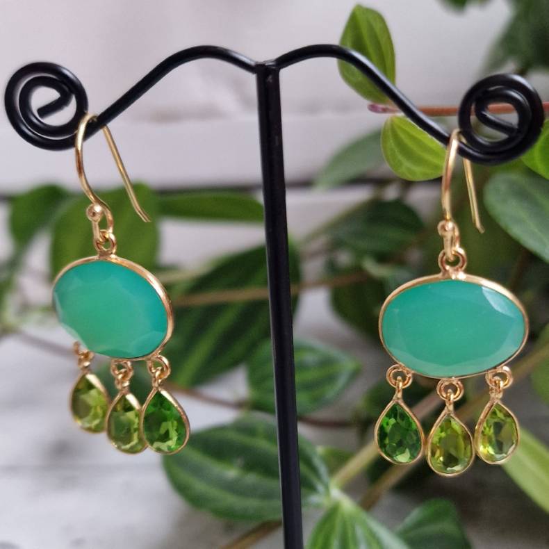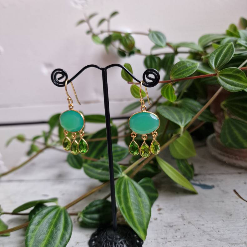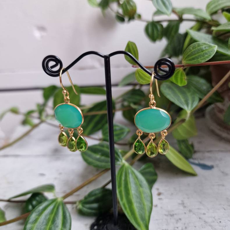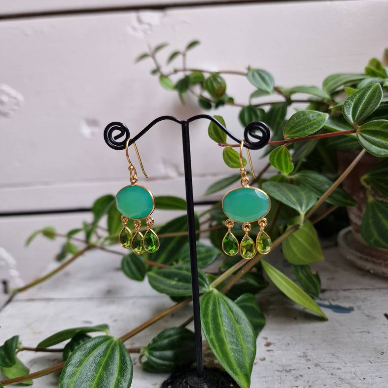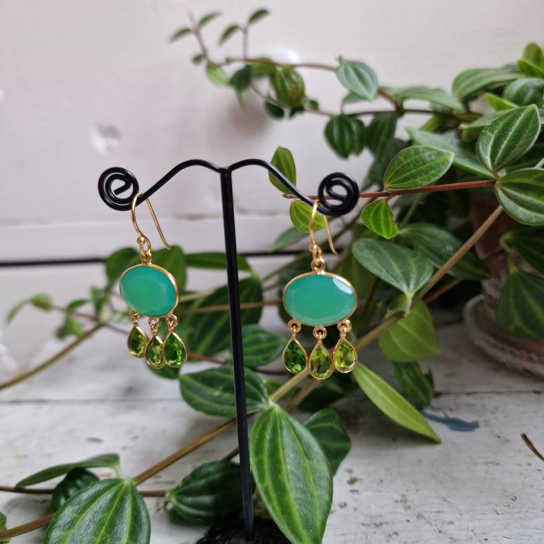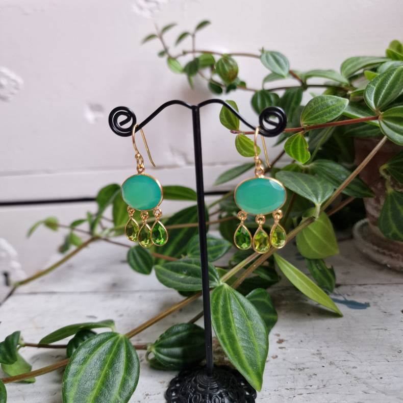 Håndlavede boheme-øreringe med facetslebne grønne quartz og tre små peridot farvede dråber. Alle metaldele er i ægte guldforgyldt messing, hvilket giver en varm glød og eksklusiv finish.
