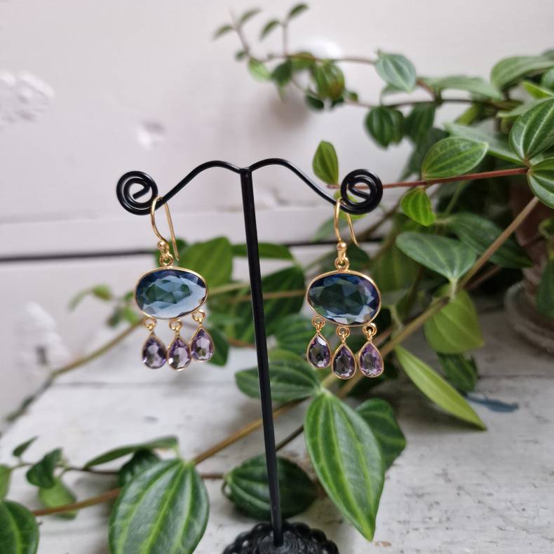 Boheme-øreringe med Mørkeblå Quartz og Lilla Dråber – Forgyldt Messing