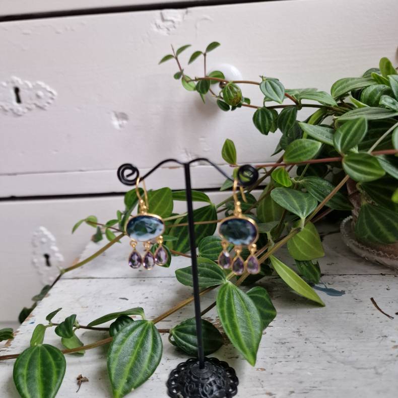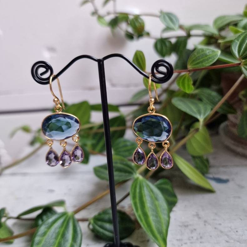 Smukke og iøjnefaldende øreringe i boheme-luksusstil med en stor, facetsleben mørkeblå krop, der giver dybde og et elegant farvespil. Under stenen hænger tre fine lilla dråber på ca. 1 cm, som tilfører et feminint og levende udtryk med let bevægelse.