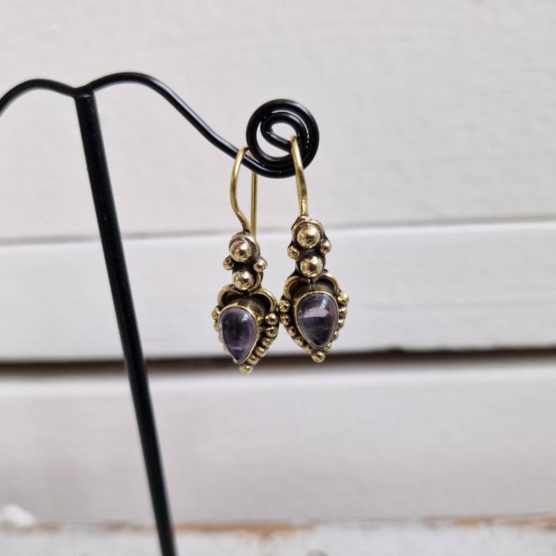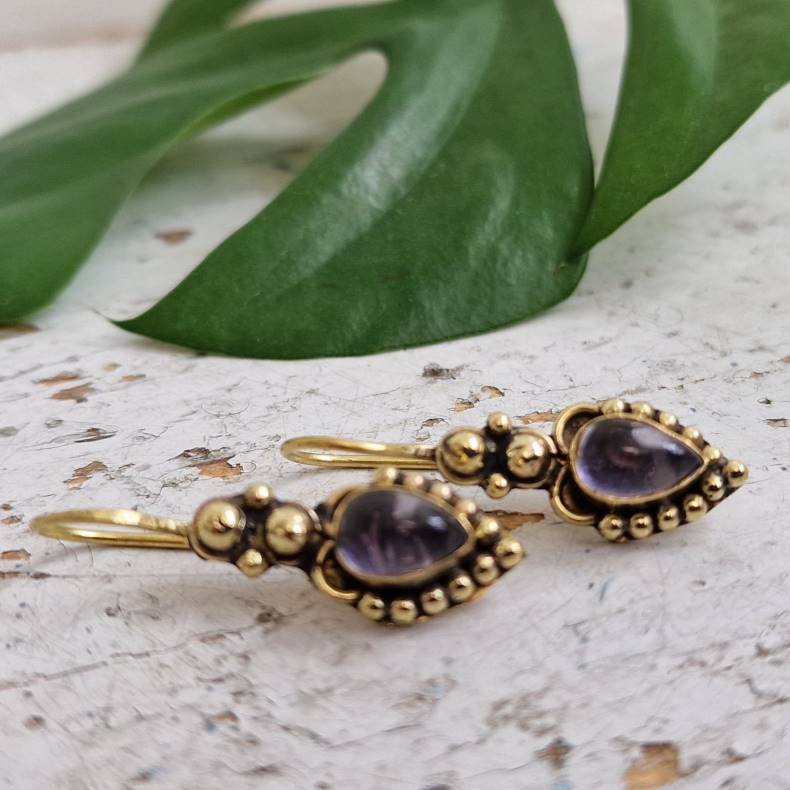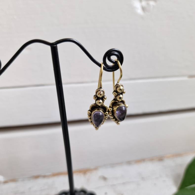 Disse smukke indiske ørehængere i messing emmer af boheme-luksus og traditionel elegance. Med deres fine små amatyst sten og delikate kuglebesætninger skaber de et raffineret udtryk, der balancerer det eksotiske og det tidløse. Perfekte til både hverdag og festlige anledninger.