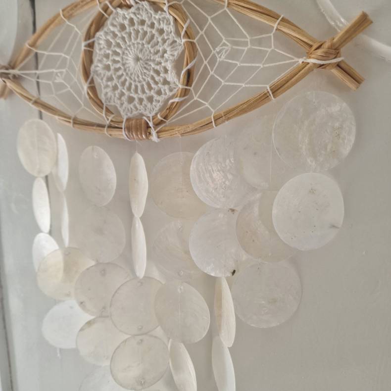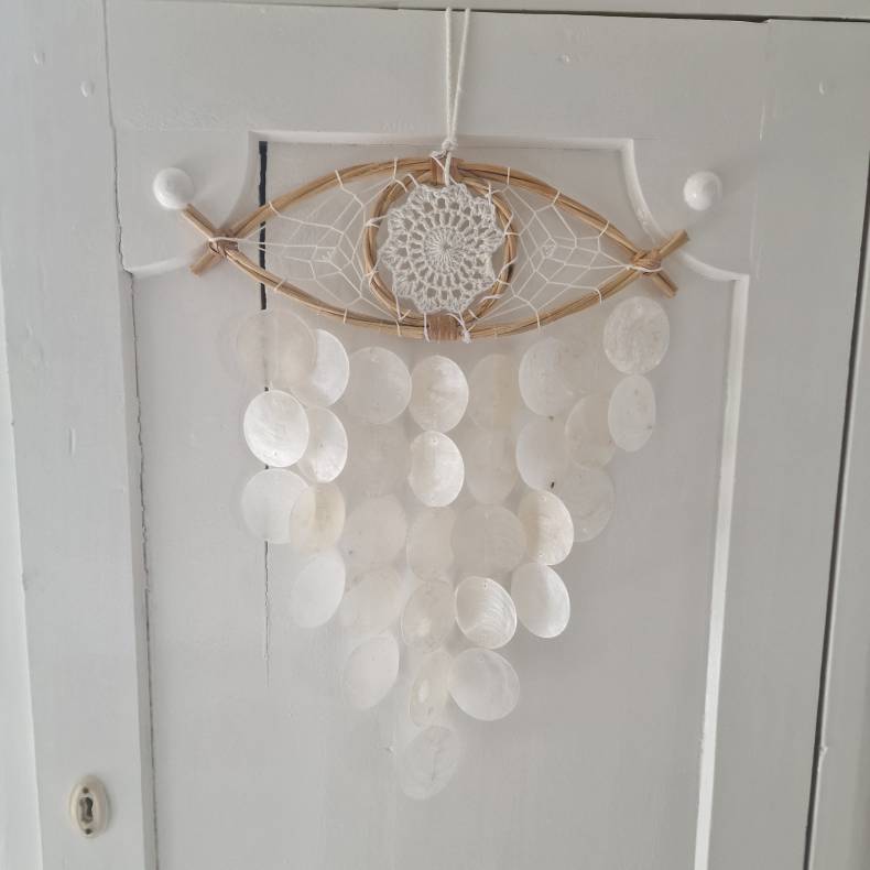 Nederst hænger naturlige skaller, som giver en blid, beroligende vindspilslyd, når vinden leger med dem.