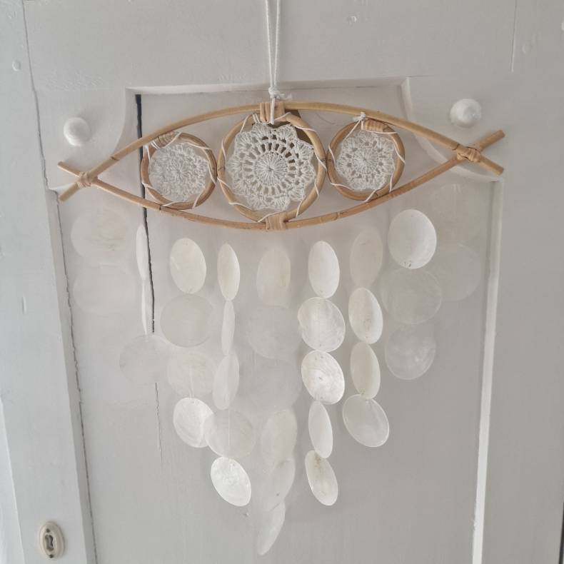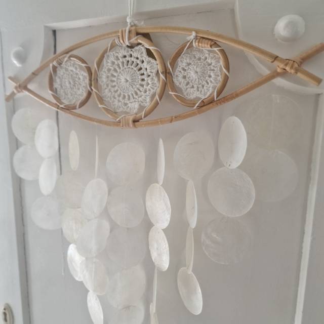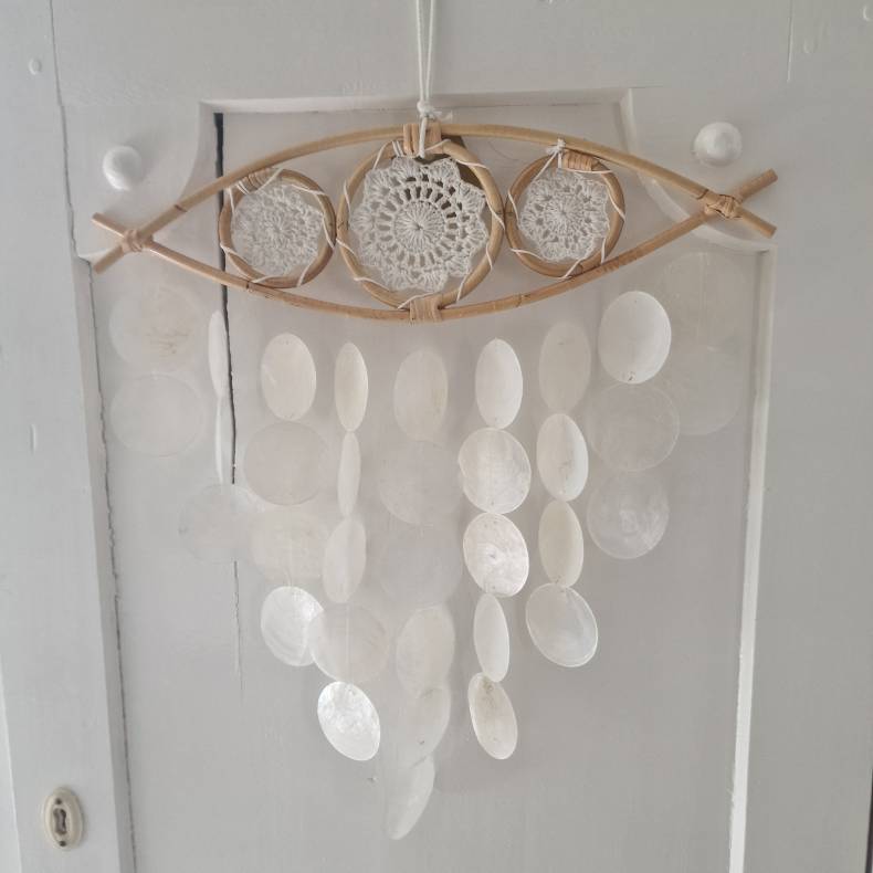 Fra bunden hænger naturlige skaller, der danser i vinden og skaber en rolig vindspilslyd. Samlet længde inkl. skaller: ca. 42 cm.