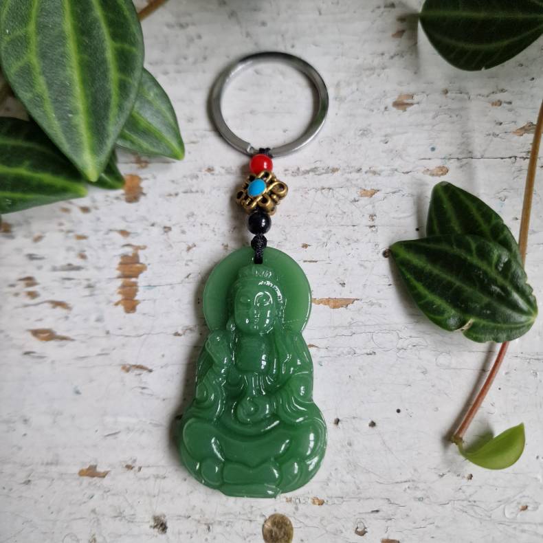 Smuk og dekorativ nøglering med Guanyin, den buddhistiske gudinde for medfølelse, nåde og beskyttelse. Guanyin anses i mange asiatiske traditioner som en beskytter, der bringer ro, omsorg og positiv energi til dem, der bærer hendes symbol.