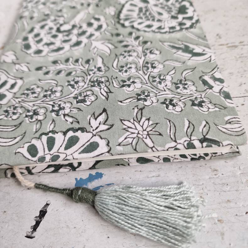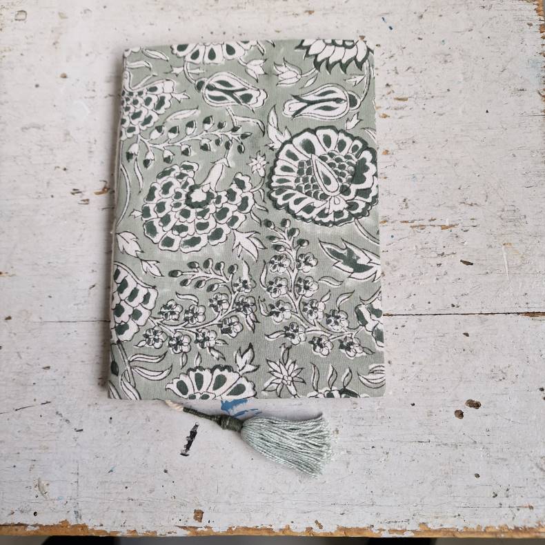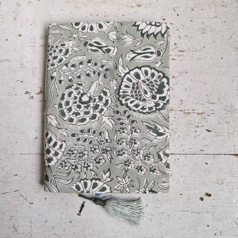 Forkæl dine sanser med vores smukke bloktrykte bog, der pryder en grå baggrund med elegante blomster i nuancer af grønt. Hver side er som en invitation til at dykke ind i en verden af kreativitet og inspiration.