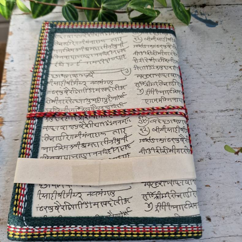 Smuk håndlavet notesbog med et fint motiv af Ganesha, den hinduistiske gud der symboliserer visdom, held og evnen til at fjerne forhindringer. Motivet er rigt dekoreret med farver og fine detaljer, som giver bogen et varmt og spirituelt udtryk.