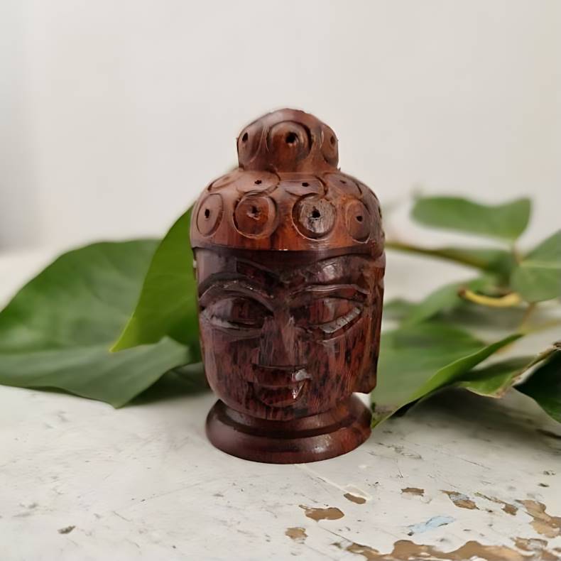 En smuk, håndlavet æske eller figur, udskåret af det fineste rosentræ til formålet som et buddha hoved. Det er ikke bare en simpel beholder, men et kunstværk i sig selv, hvor hver detalje er omhyggeligt fremstillet med et fint skåret gevind, der delikat adskiller æsken i to.