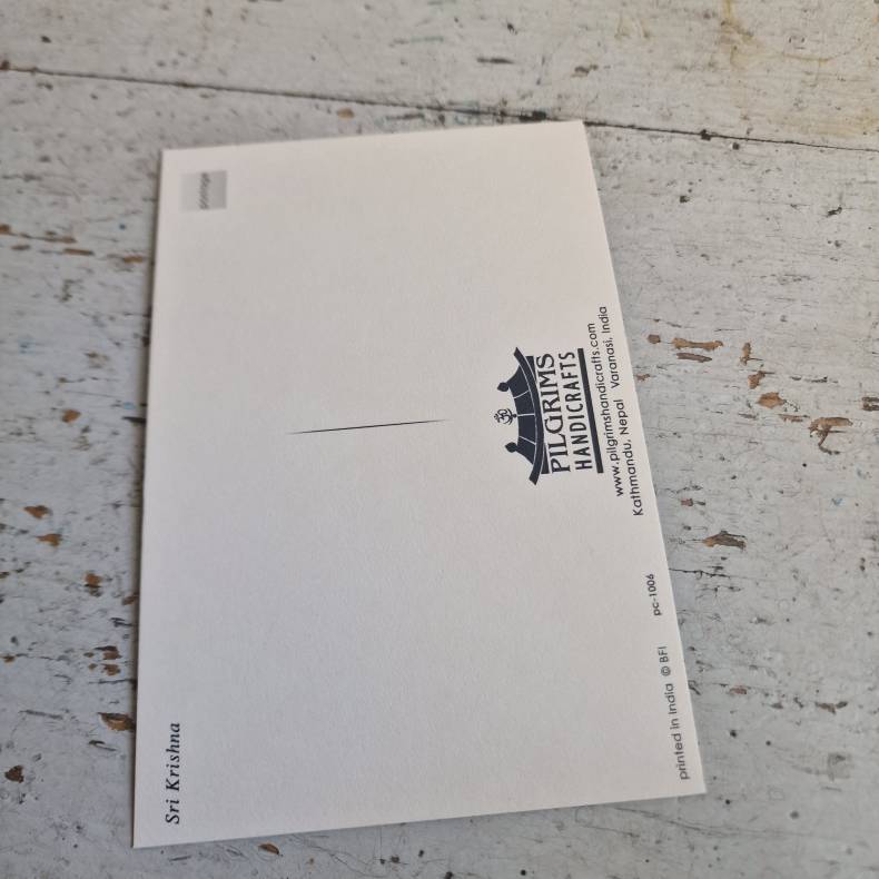 Smukt postkort med motiv af Sri Krishna i dæmpede, harmoniske farver. I
