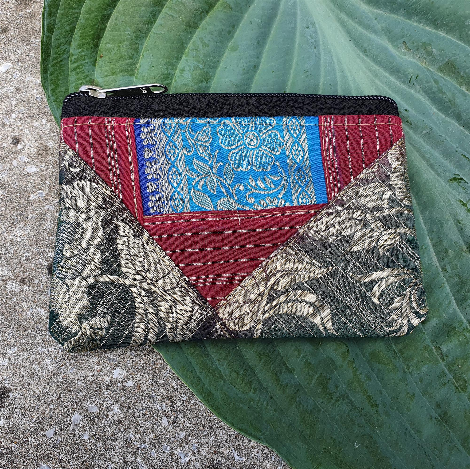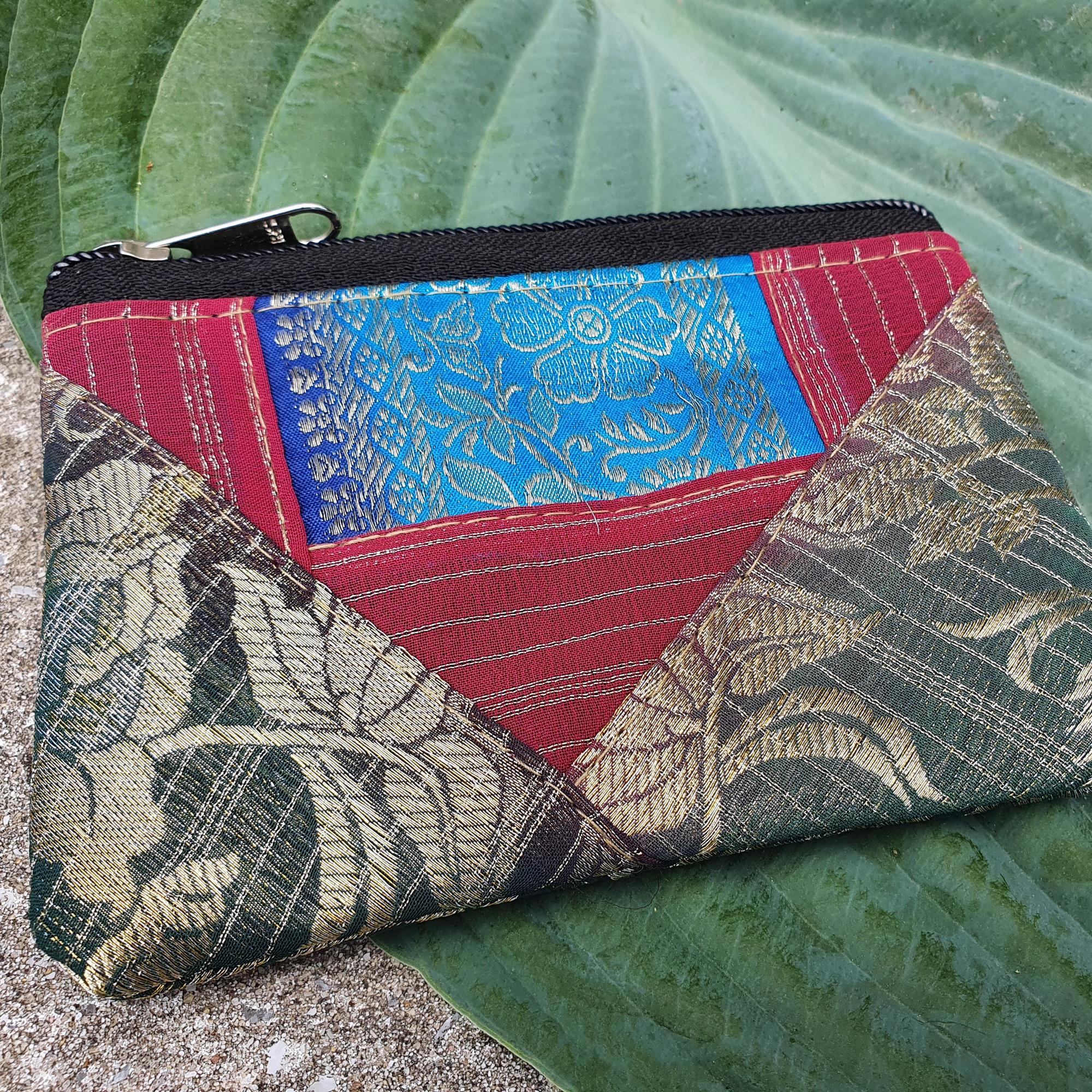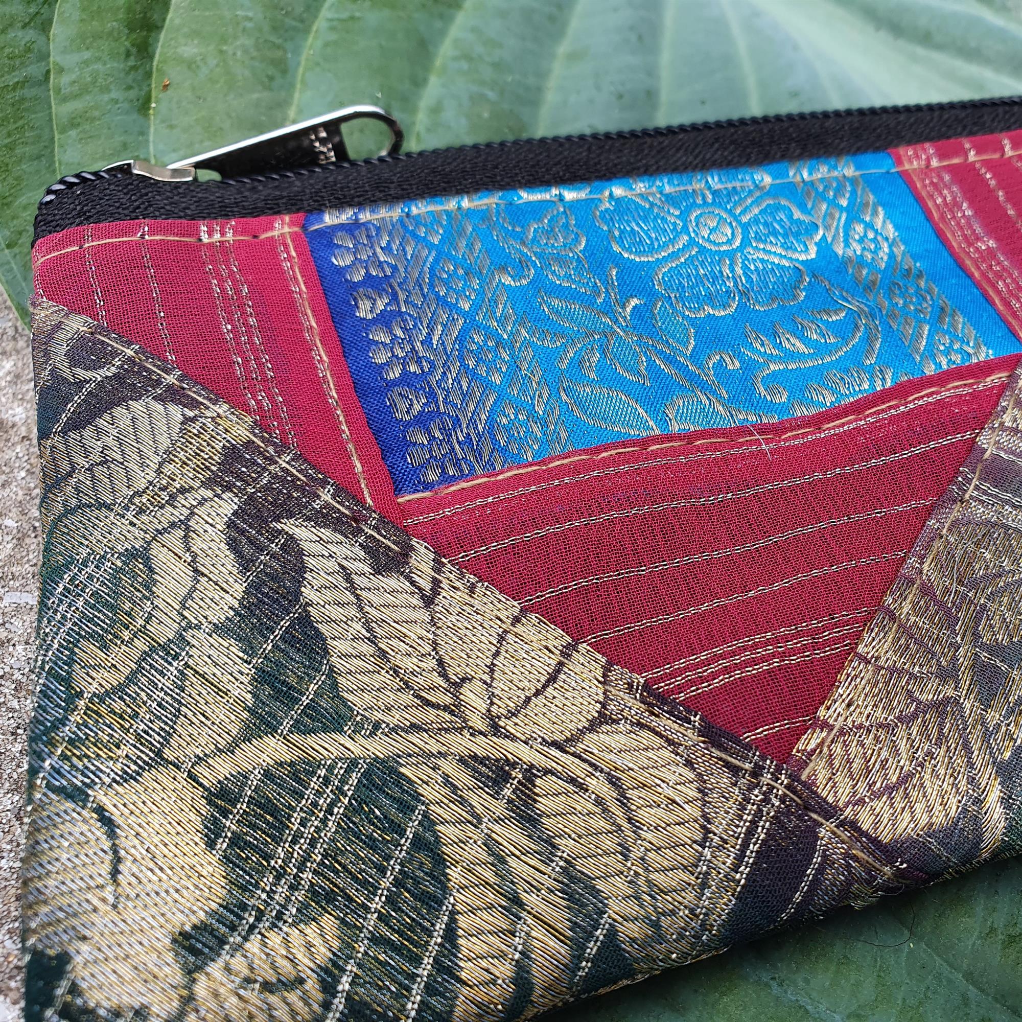Se denne unikke silkepung, håndlavet i Indien og designet til at fortrylle enhver stilbevidst person. Farverne mørkeoliven og rød smelter elegant sammen i et smukt patchwork-mønster, der vidner om ekspertise og omhu. Den fine lynlås sikrer, at dine værdigenstande altid er trygge og tæt forseglet. Indvendigt er pungen foret med sort stof, der giver en luksuriøs fornemmelse.