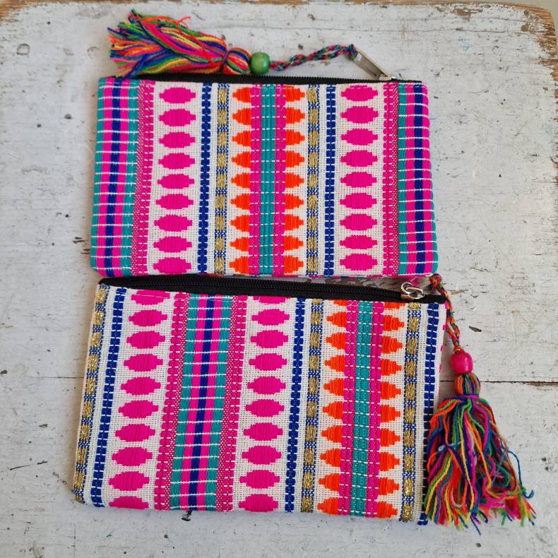 En blød, vævet bomuldspung i en livlig kombination af pink og orange. Denne charmerende accessory er perfekt til at opbevare dine vigtigste ting med stil. Udstyret med en praktisk lynlås, en farverig tassel og en elegant træperle, tilføjer den et strejf af personlighed til enhver outfit.