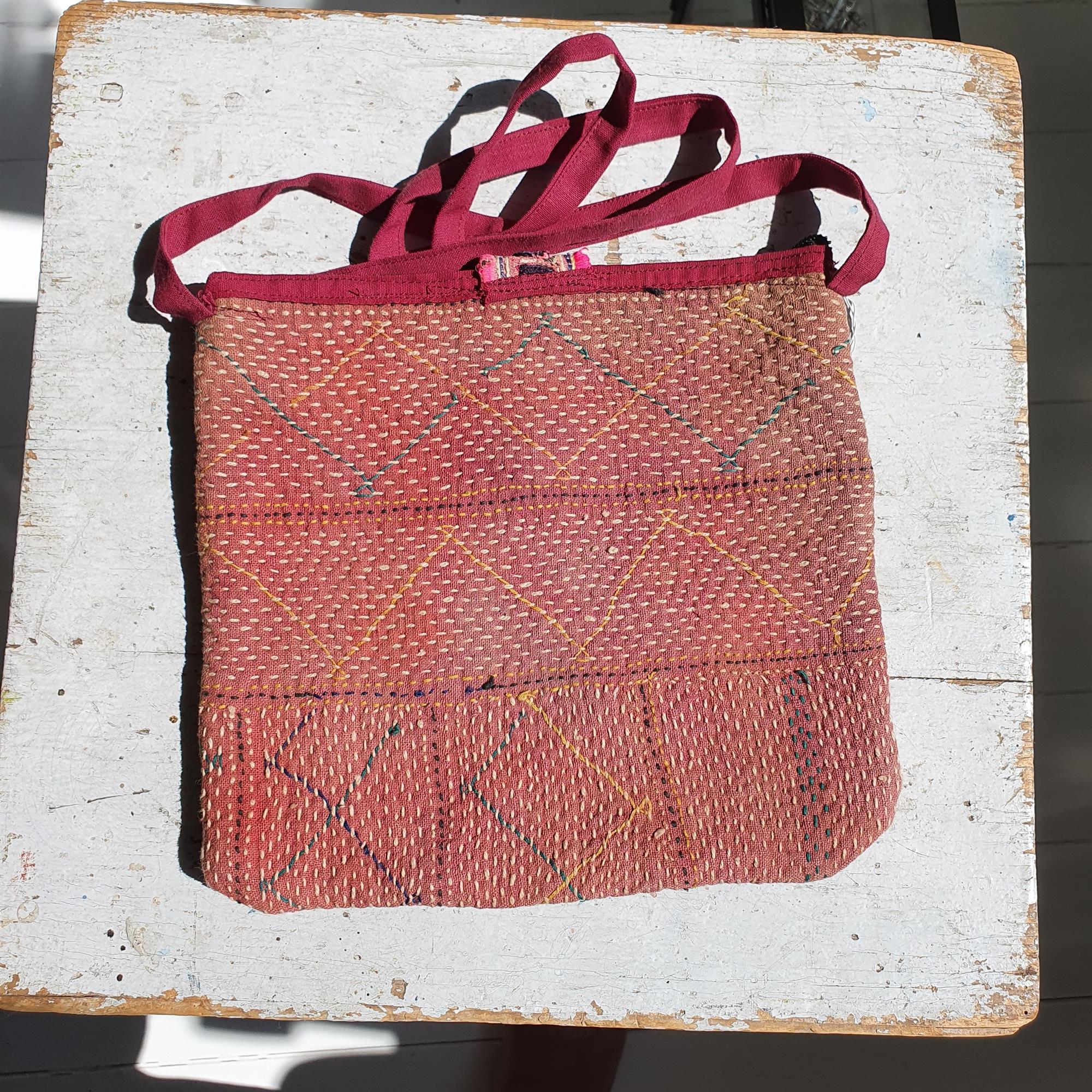 Bagsiden er et stykke blødt kantha , altså vintage stof, i flere lag stof, syet sammen med små sting....