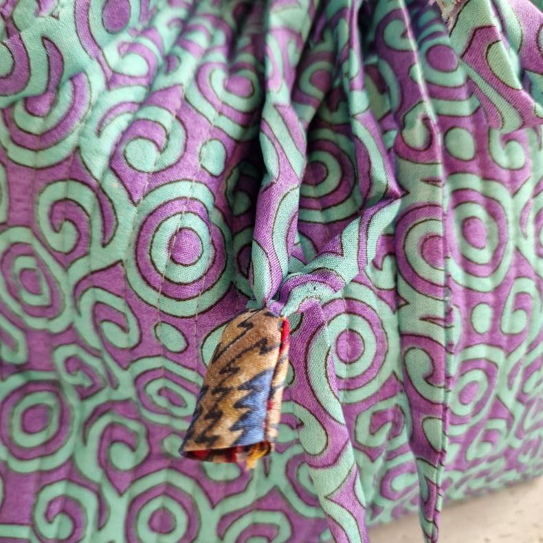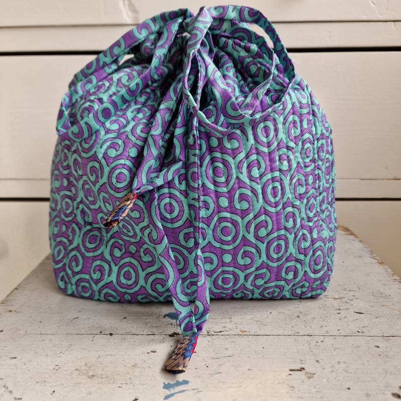 Forestil dig en projekttaske, der er lige så unik som dine kreative idéer. Denne smukke taske i lilla og turkis cirkler er lavet af vintage silke saree, og der findes kun én af denne slags. Den lukkes nemt med to snore, så du kan sikre dit strikketøj, hækleprojekter eller noget helt tredje.