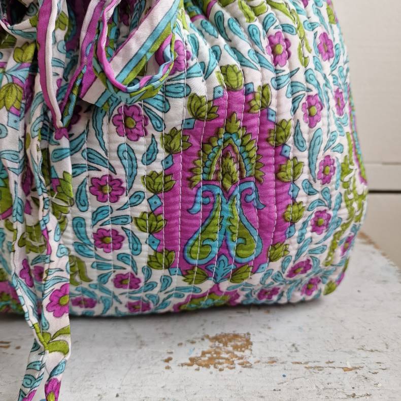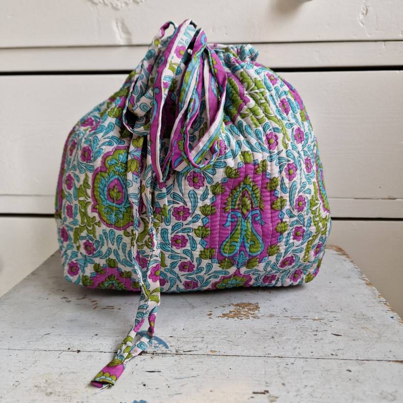 Mangler du en taske til dit strikke- eller hækleprojekt? Vores håndlavede unika-tasker er perfekte til dine kreative sysler. Hver taske er syet af vintage silkesareer og har en kontrastfarve indvendigt, som giver den et ekstra pift.