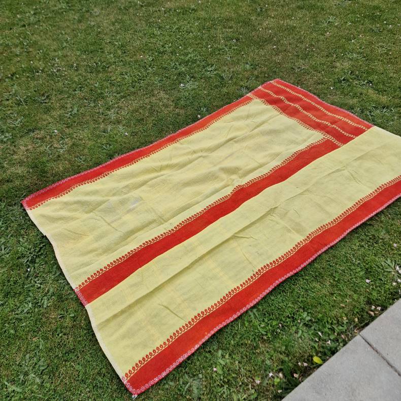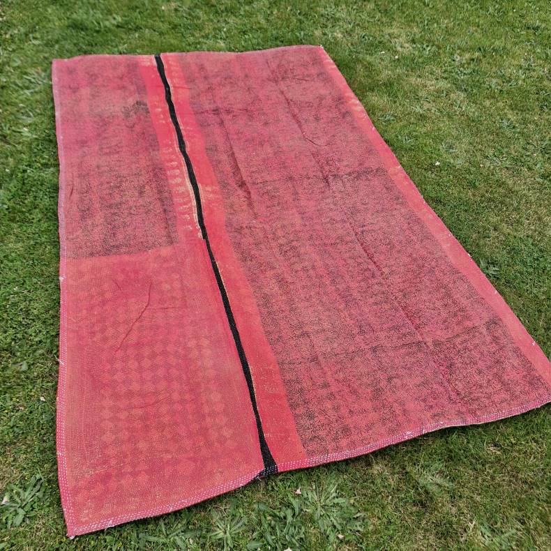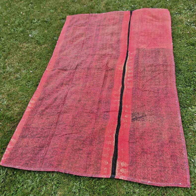 Lad dig fascinere af et stykke håndværk, der fortæller historier fra fjerne egne. Dette unikke Kantha sari-tæppe, håndsyet af genbrugte sarier, kombinerer gul, hvid, rød og sort i et smukt mønster, der oser af både tradition og kreativitet.