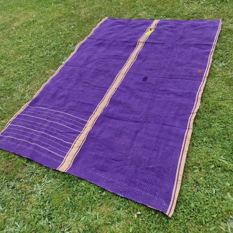 Bring farve og historie ind i dit hjem med vores unikke Kantha tæppe! Hver eneste stykke er skabt af smukt sammenføjede sarier, der bærer på fortællinger fra Indien. De bløde nuancer af turkis, blå, brun, grøn, gul, hvid, lilla og orange danser i et harmonisk mønster, der vil løfte enhver indretning.