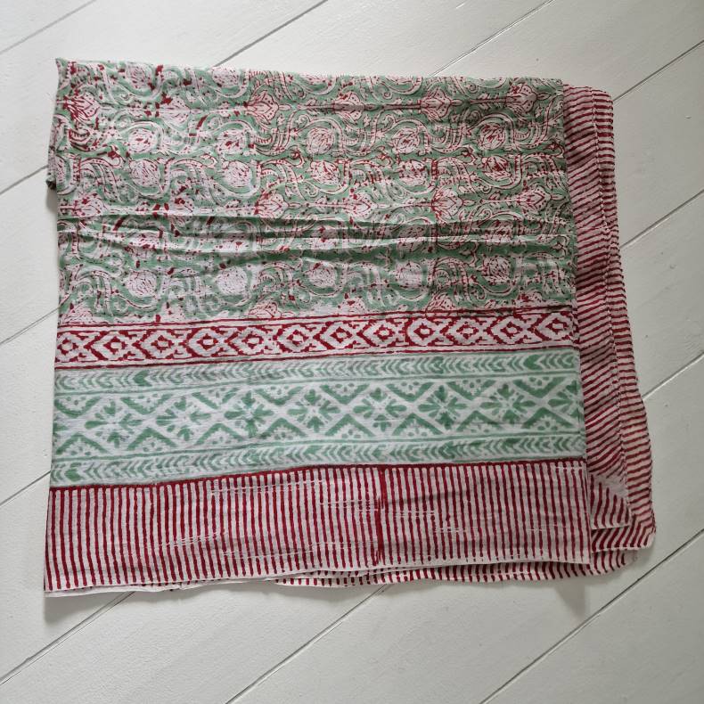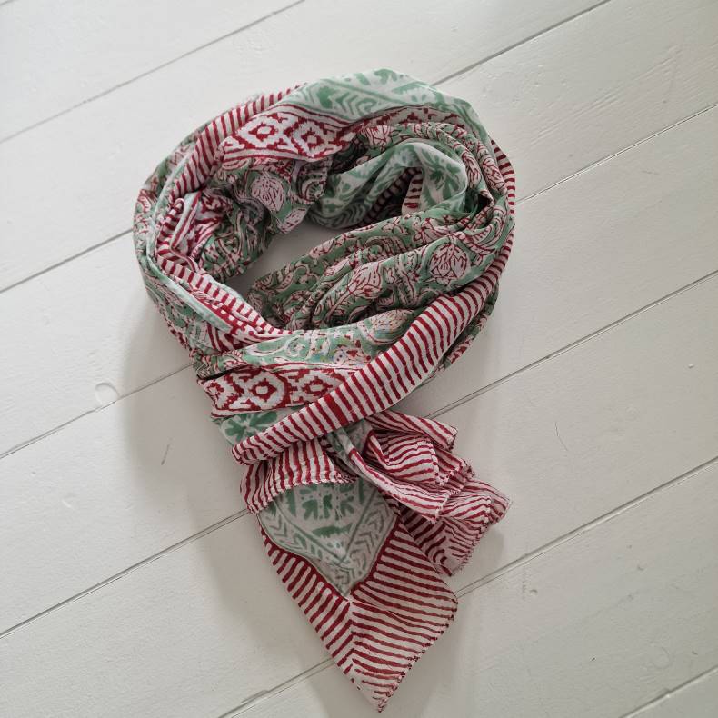 Bloktrykt bomulds tørklæde grøn/rød 118x195