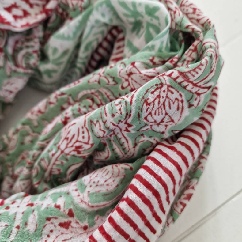 Dette smukke tørklæde er håndtrykt med traditionel indisk bloktryksteknik, hvilket gør hvert stykke unikt. Kombinationen af grønne og røde nuancer skaber et farverigt spil, der tilføjer personlighed til enhver garderobe.