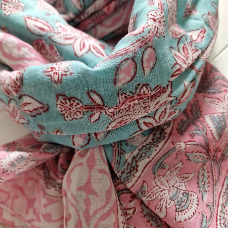 Bloktrykt bomulds tørklæde turkis/hvid/rød/pink 117x183