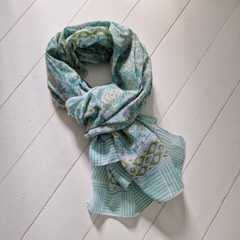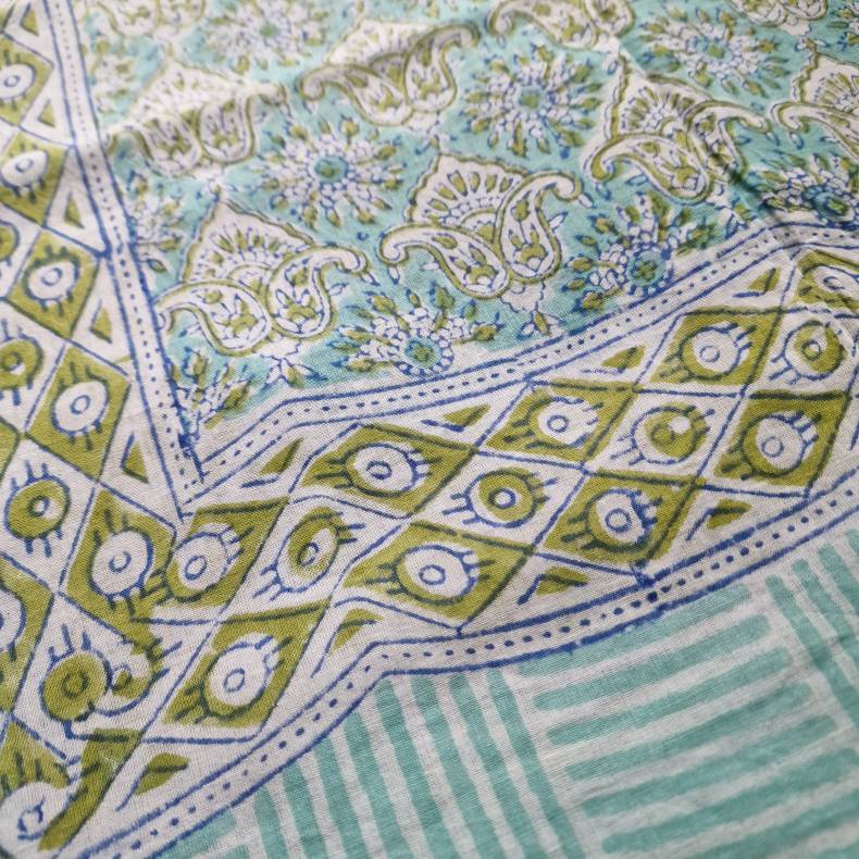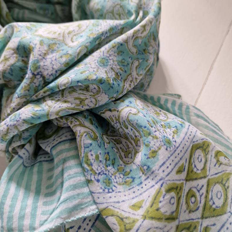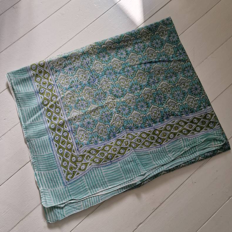 Bloktrykt bomulds tørklæde grøn/turkis/hvidt 116x187